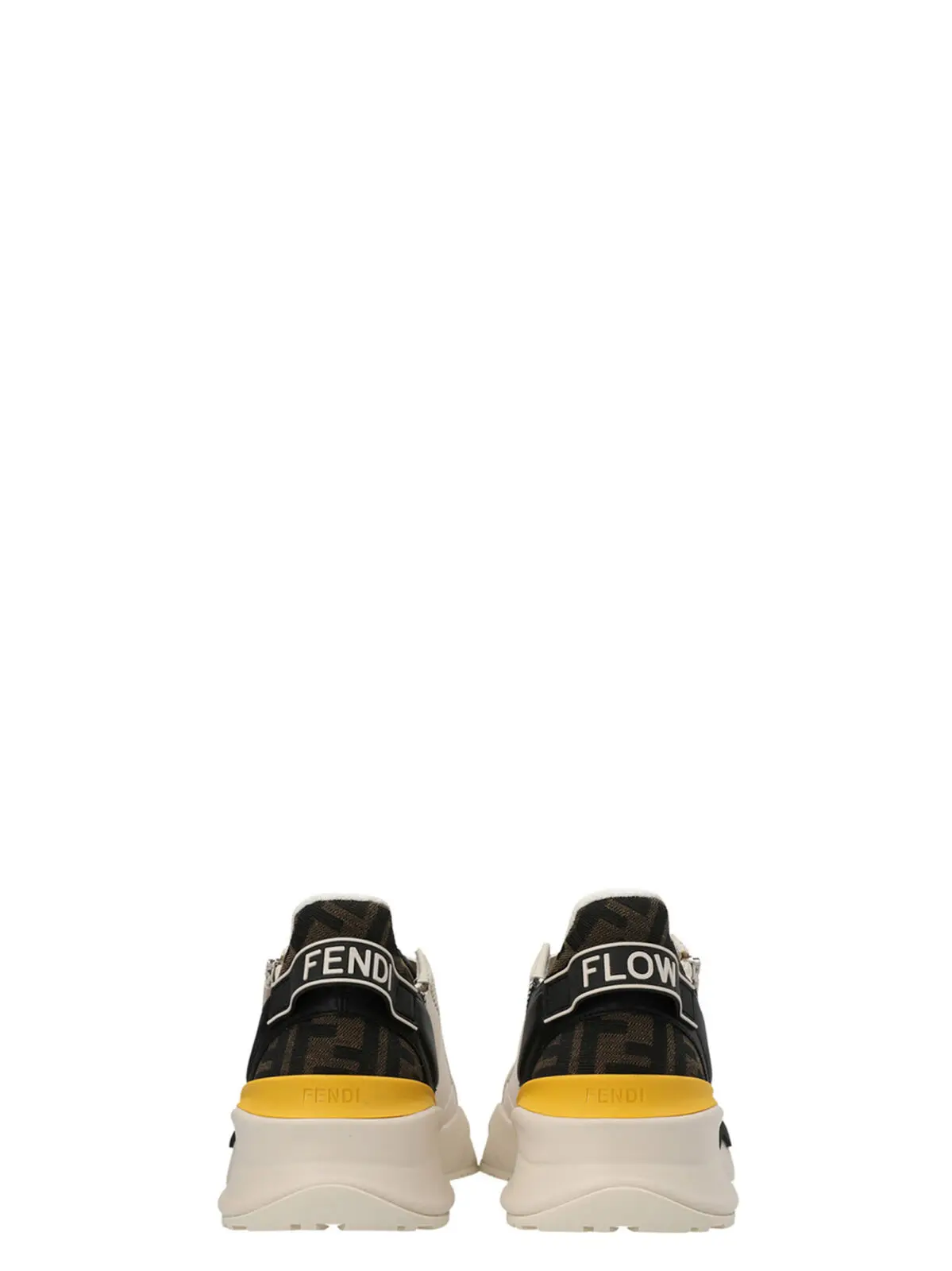 Чоловічі багатокольорові кросівки Flow Fendi зі шкіри, оснащені еластичними шнурками та бічною блискавкою. Взуття має зубчасту підошву F, логотип Fendi Flow на п’ятах, деталі з тканини FF jacquard, язичок з Lycra® у візерунку FF та легку гумову підошву білого кольору з чорними діагональними деталями.