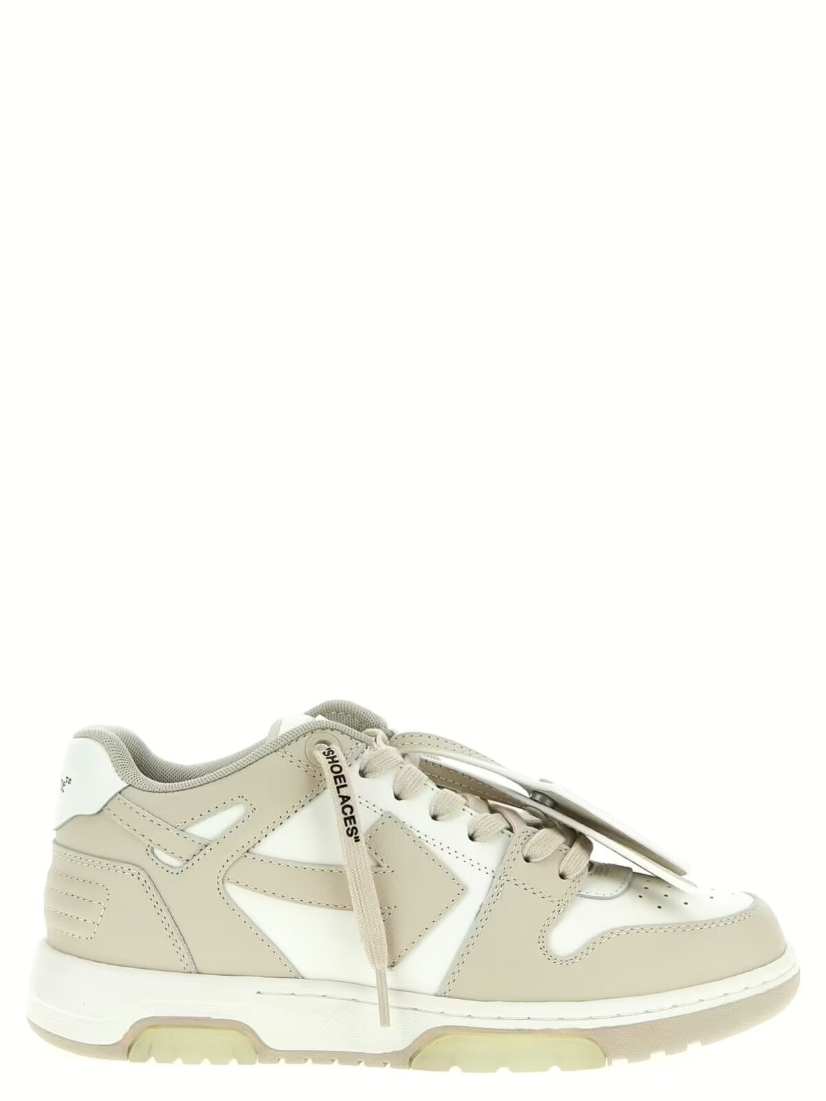 Жіночі кросівки Out Of Office від Off-White, виконані в бежевому кольорі, поєднують в собі елегантність та спортивний стиль. Виготовлені з якісної шкіри теляти (89%) та поліестеру (11%), вони забезпечують комфорт та довговічність. Контрастні деталі, шнурівка та гумова підошва додають взуттю виразності.