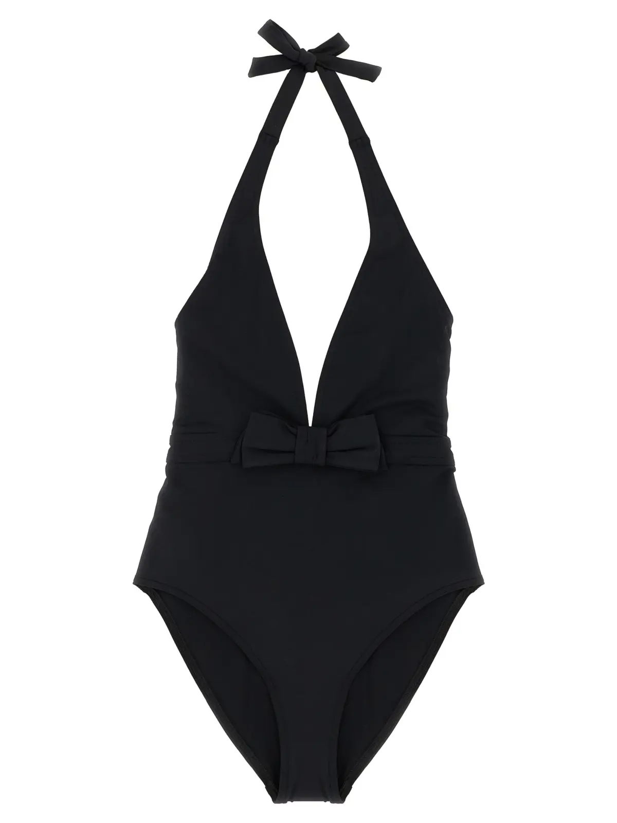 Одношаровий купальник з тканиною Peau Douce. Глибокий V-подібний виріз спереду. Перекриваючася смуга на талії з бантом в тон. Зав’язки для фіксації на шиї. Широкий круглий виріз на спині. Класичний крій штанини. Склад 77% поліамід, 23% еластан.