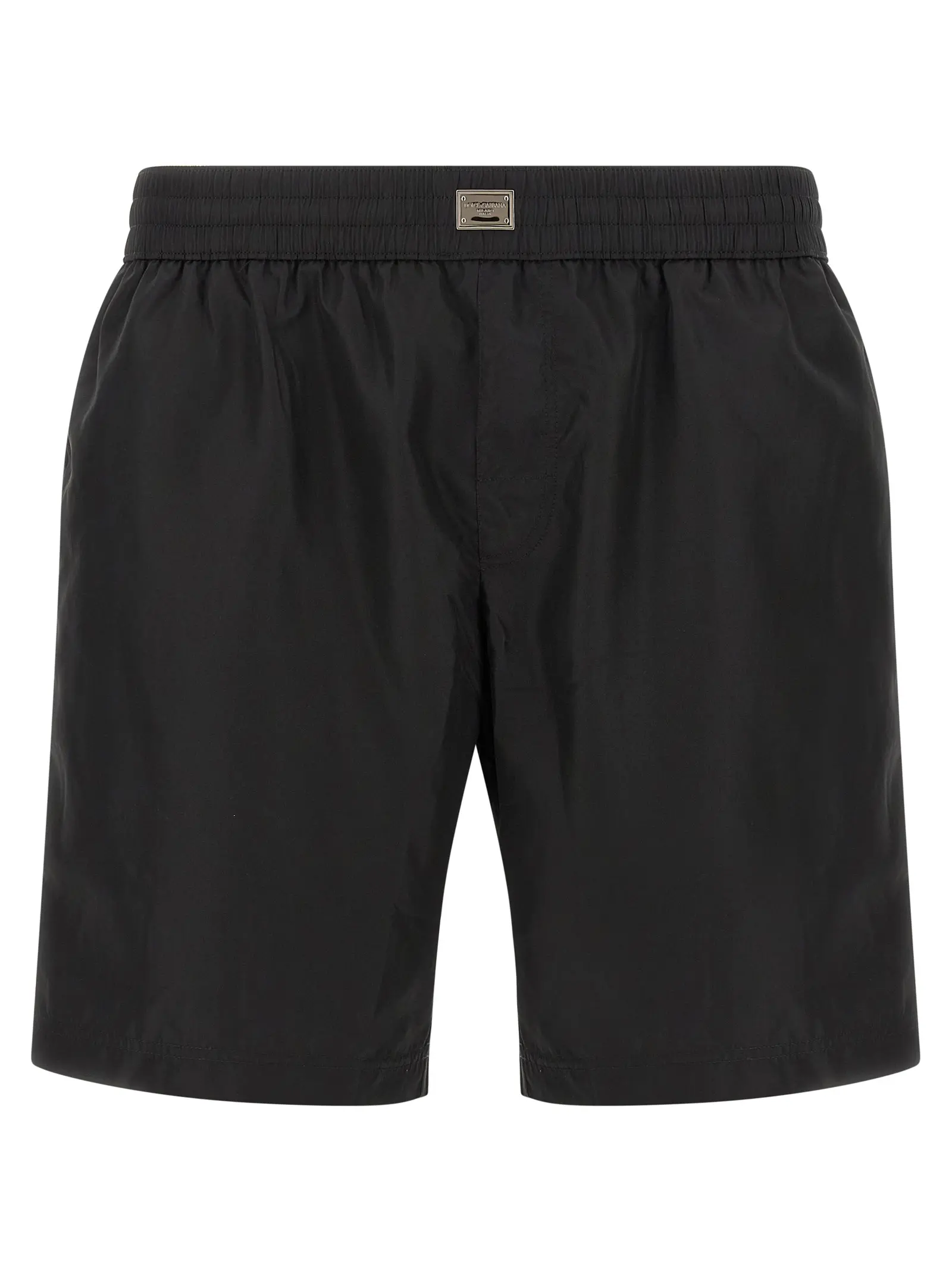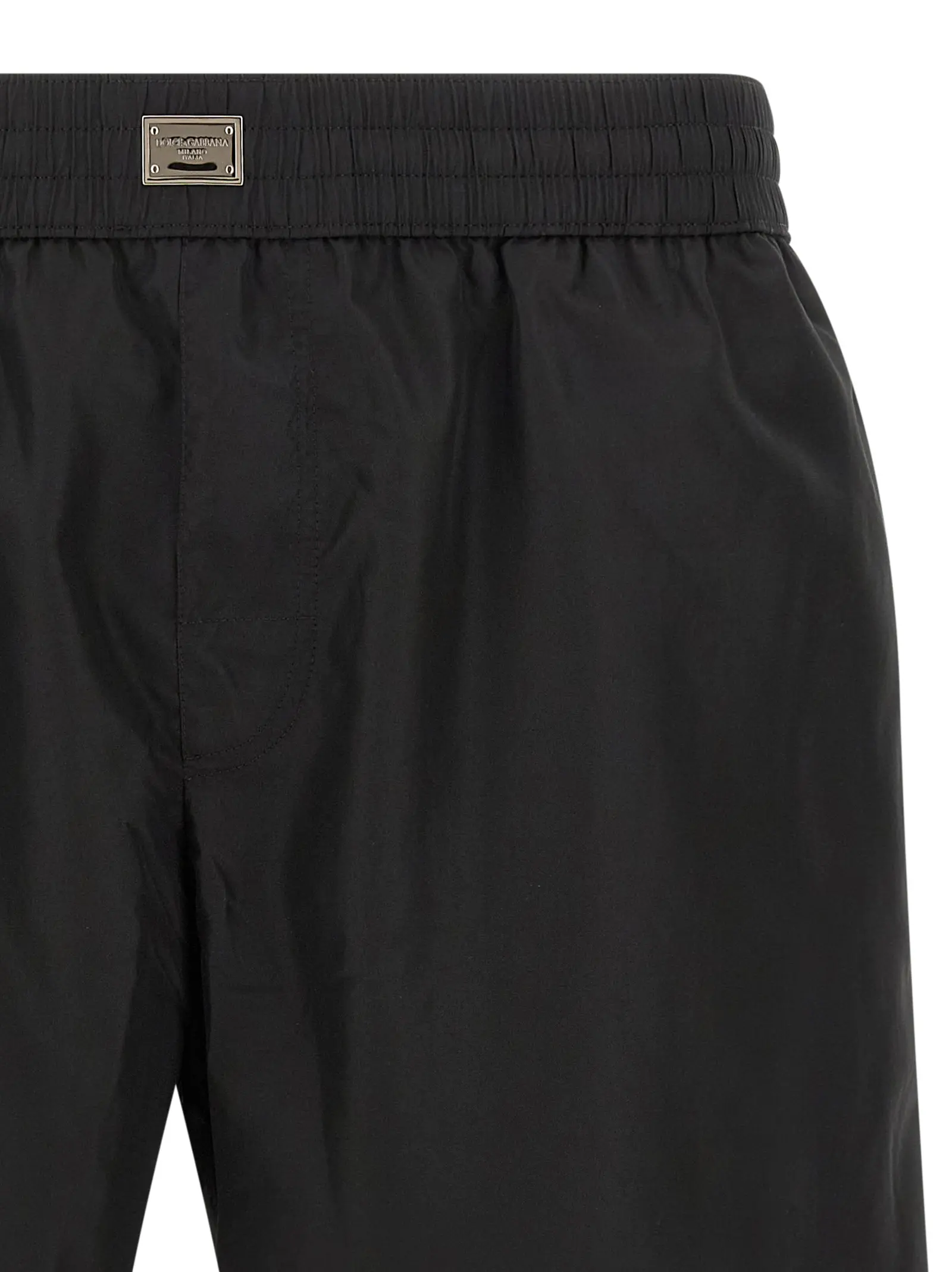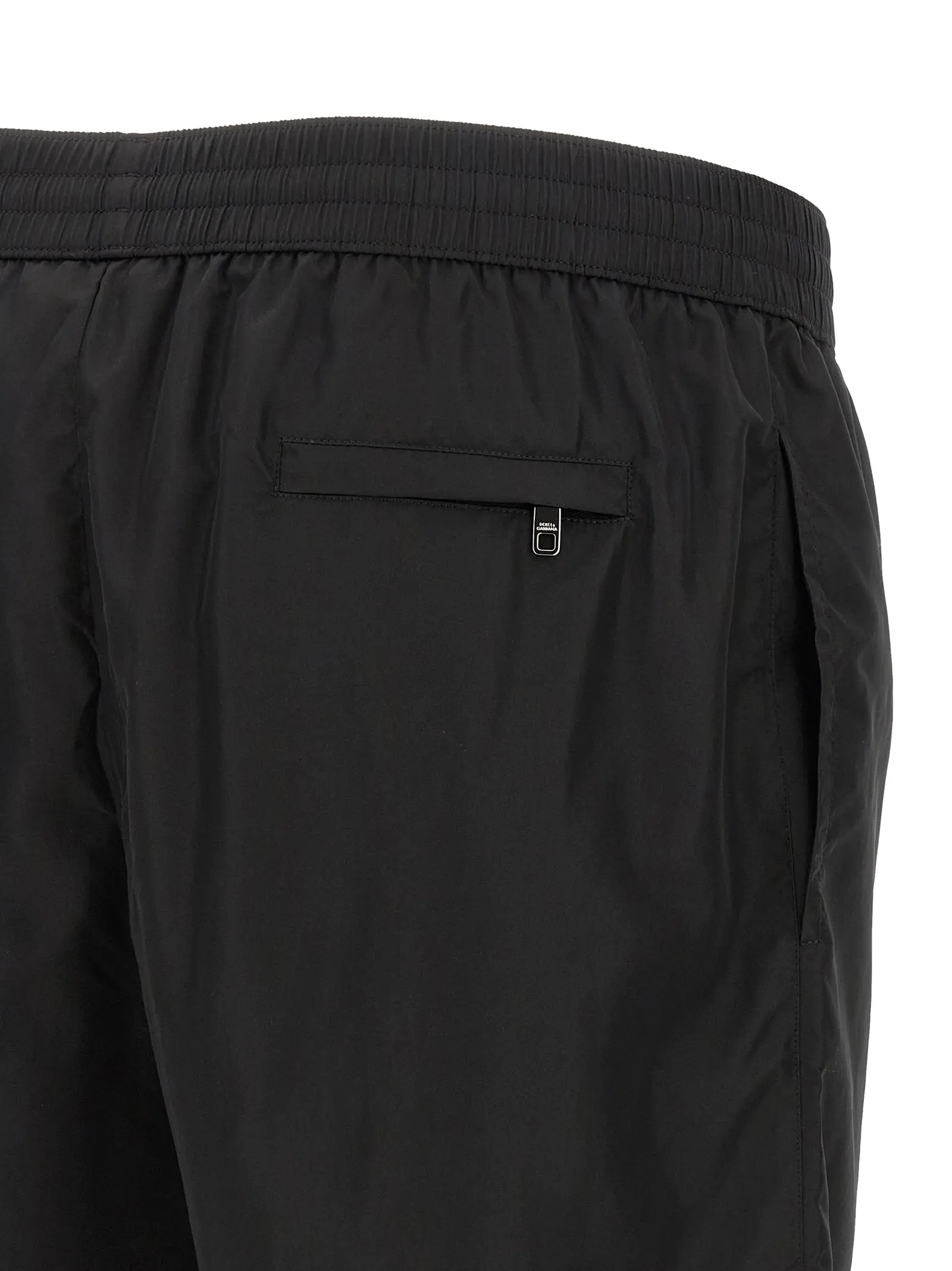Чоловічий купальник чорного кольору з легкої нейлонової тканини поєднує вишуканість та комфорт, оснащений регульованим еластичним поясом і внутрішніми плавками для ідеальної посадки. Металева пластина з гравіюванням логотипу підкреслює преміальний стиль, а практичні кишені та декоративний клапан додають функціональності та сучасного шарму.