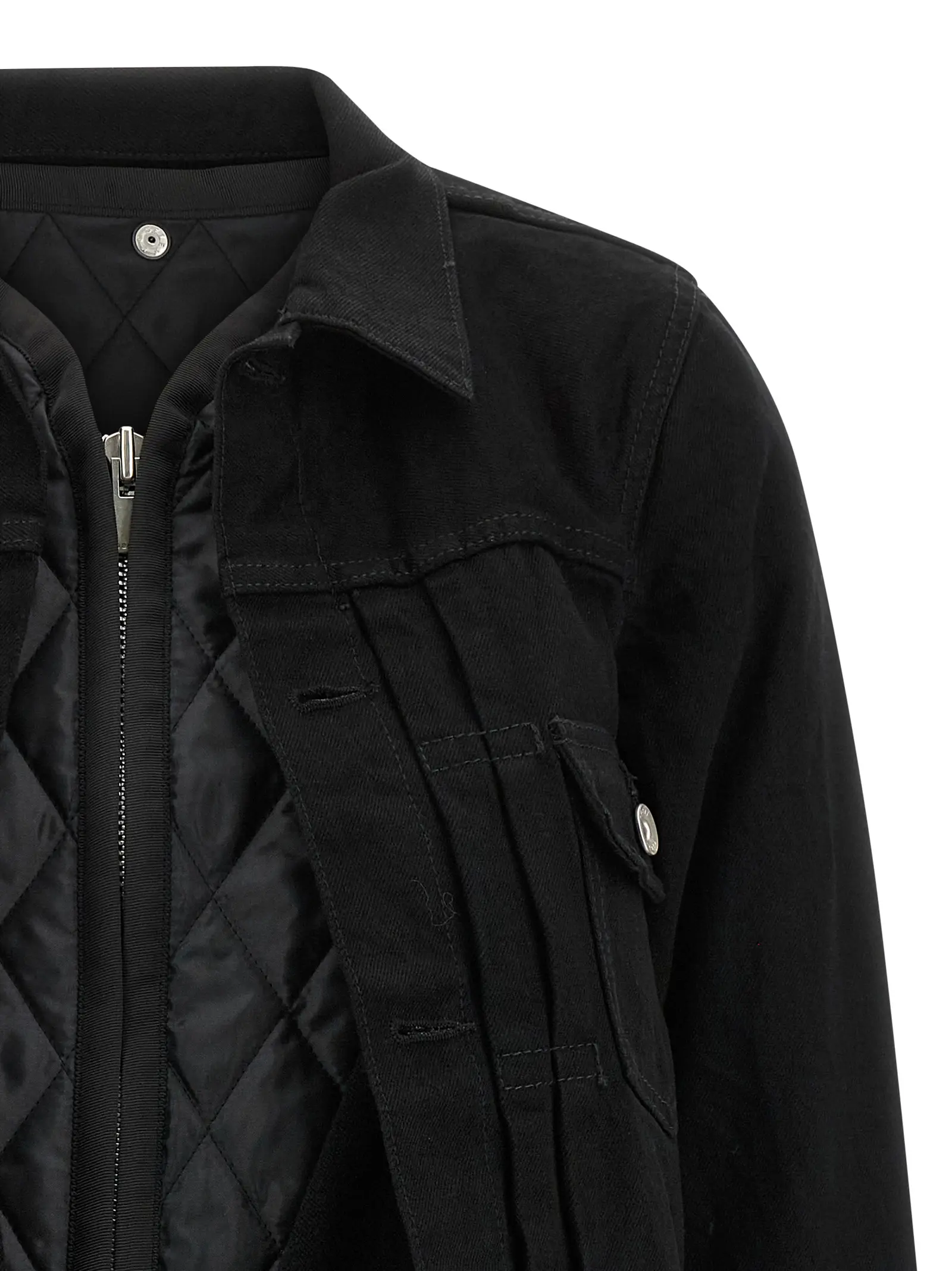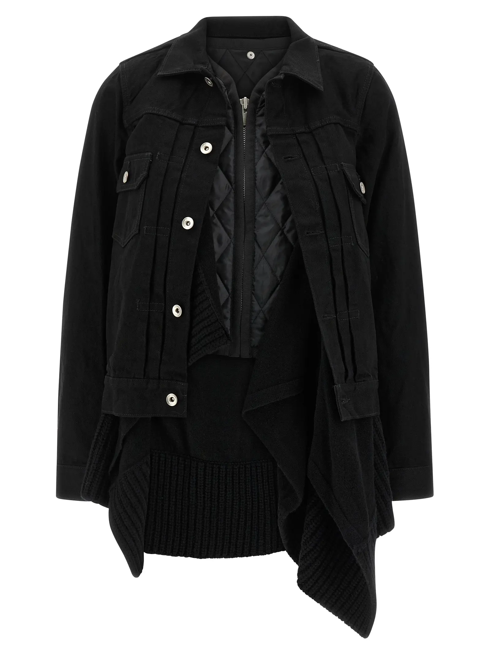 Чорна двошарова куртка 2в1 із деніму поєднує виняткову якість 100% бавовни з інноваційним дизайном: знімний стьобаний жилет з нейлону та вовни додає універсальності, а асиметричний низ і комір сорочкового типу створюють вишуканий стиль, що підкреслює статус і бездоганний смак.
