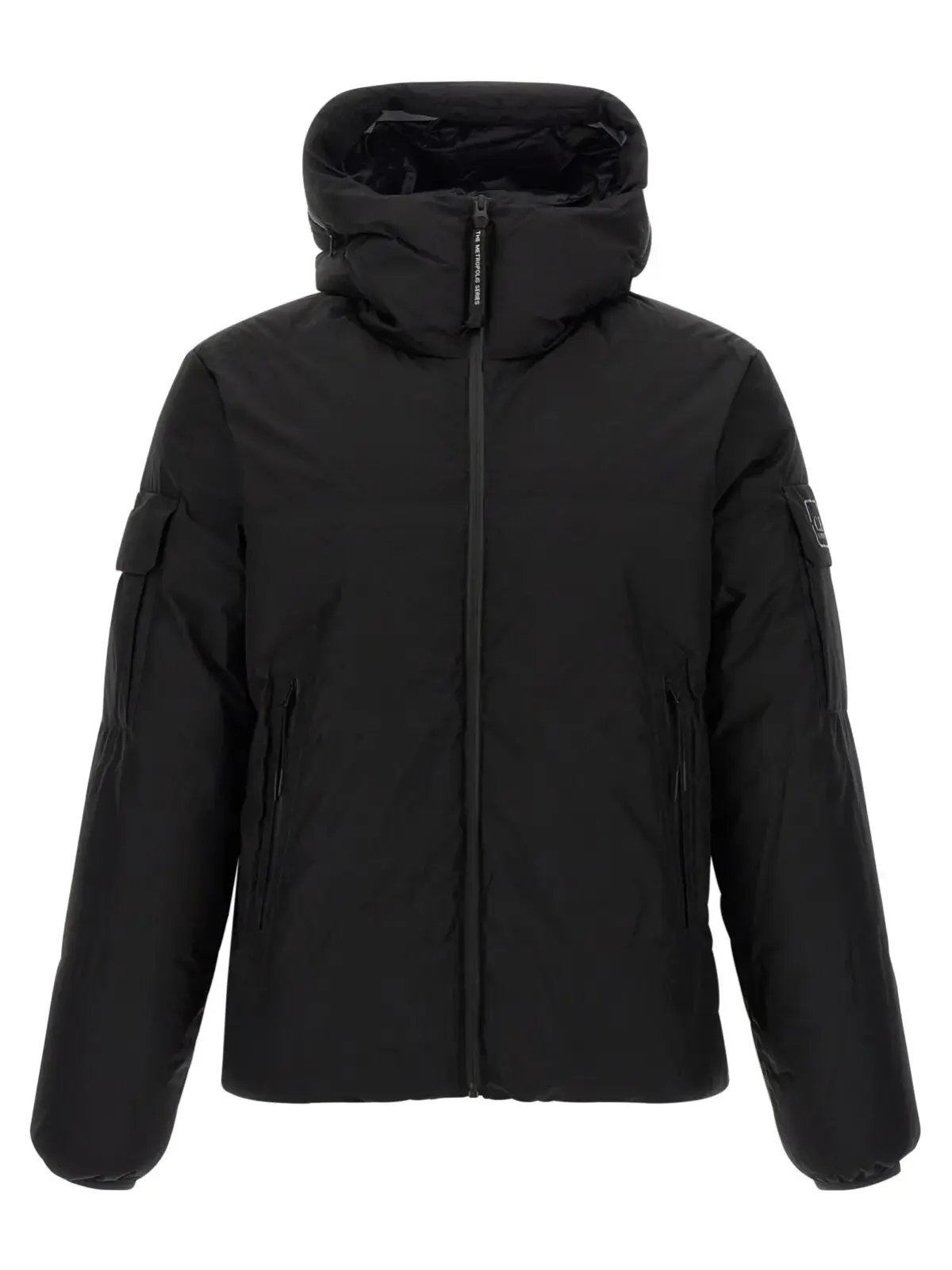 Чорна пухова куртка з серії Метрополіс виконана з міцної тканини ripstop на основі поліаміду, наповнена водовідштовхувальним гусячим пухом Pertex®. Вишуканий дизайн із капюшоном, високим коміром, блискавкою спереду та еластичними манжетами забезпечує комфорт і стиль, підкреслюючи статус та універсальність у будь-яких умовах.
