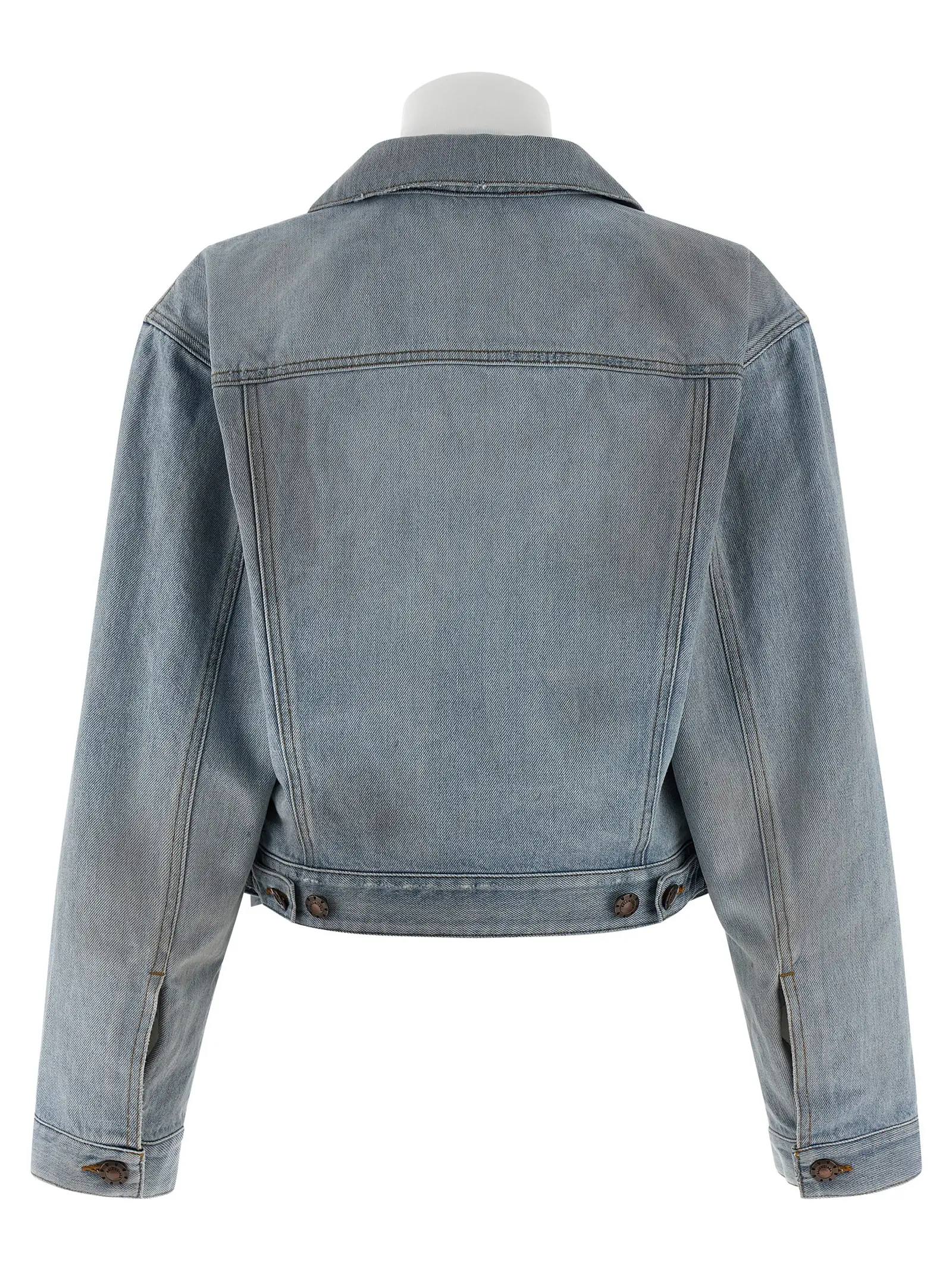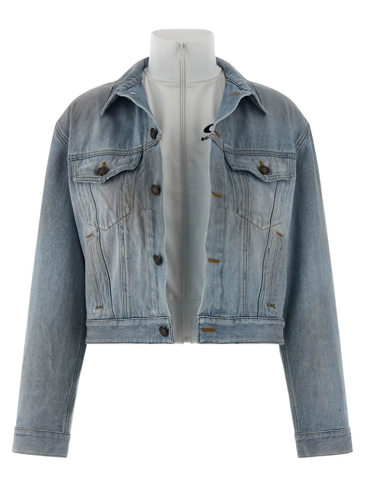 Stonewashed джинсова куртка з ефектом потертості та використання. Коротка модель. Подвійний передній шар з високим коміром-стійкою. Закривається на блискавку з бавовняною основою. Контрастна строчка. Комір сорочкового типу. Передня застібка на ґудзики. Є кишені. Довгі рукави з манжетами. Підкладка з бавовни. Тканина на 100 відсотків складається з бавовни.