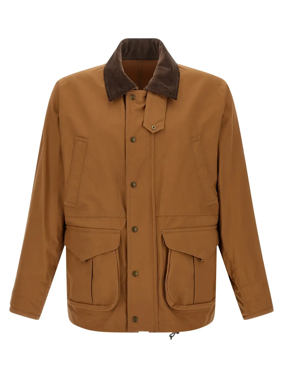 Ця коричнева чоловіча куртка з 100% бавовни поєднує бездоганну майстерність та інноваційний дизайн із вставкою з вовни в клітинку, коміром з вельвету та функціональними деталями, такими як застібка на блискавку, кнопки й регульований пояс, підкреслюючи статус і вишуканий стиль.