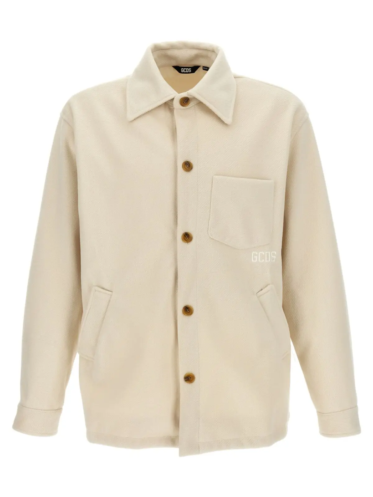 Чоловіча куртка Gcds у білому кольорі з тон-в-тон вишитим логотипом на передній і задній частині. Куртка має кишені, застібку на гудзики та довгі манжети на рукавах. Виготовлена з 100% поліестеру.
