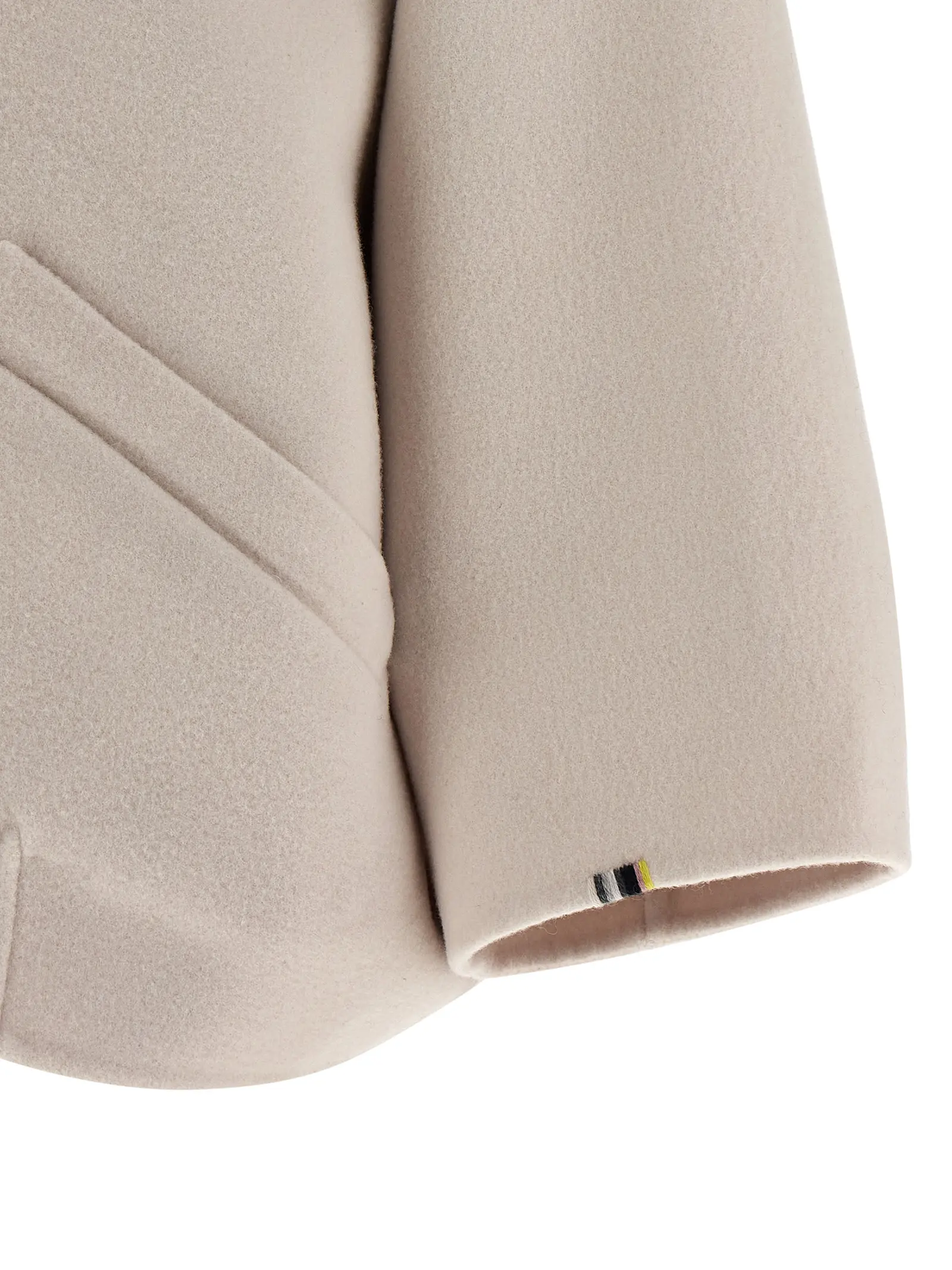 Елегантна двостороння куртка в бежевому відтінку виготовлена з вишуканої суміші 70% вовни та 30% кашеміру, що забезпечує неймовірну м’якість і тепло. Модель з сорочковим коміром, передньою застібкою на блискавку та практичними кишенями поєднує сучасний дизайн із бездоганною функціональністю. Широкі довгі рукави та поділ із ефектом збірки додають виробу особливого шарму, підкреслюючи статус і витончений стиль власниці.