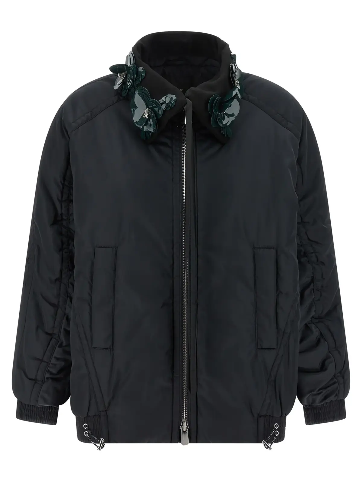 Куртка Pinko Clarinda виконана з матової технічної тканини з м’якою, злегка утепленою текстурою, поєднує інноваційний дизайн із витонченими деталями – комір сорочкового крою з знімною вставкою з флористичним оздобленням з лакованої шкіри та кристалів. Практичність забезпечують передня застібка на блискавку, кишені, еластичні манжети та регульований низ, що робить цю модель ідеальним вибором для сучасної жінки, яка цінує стиль, комфорт і статус.