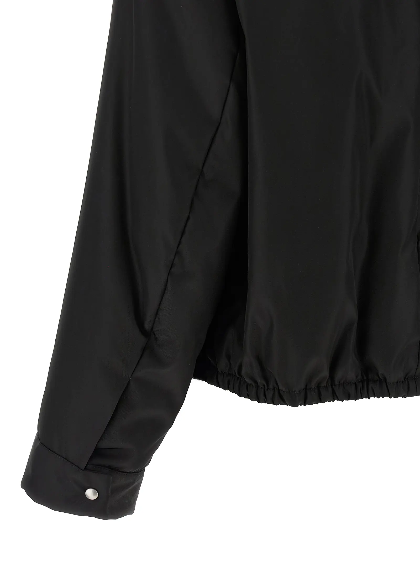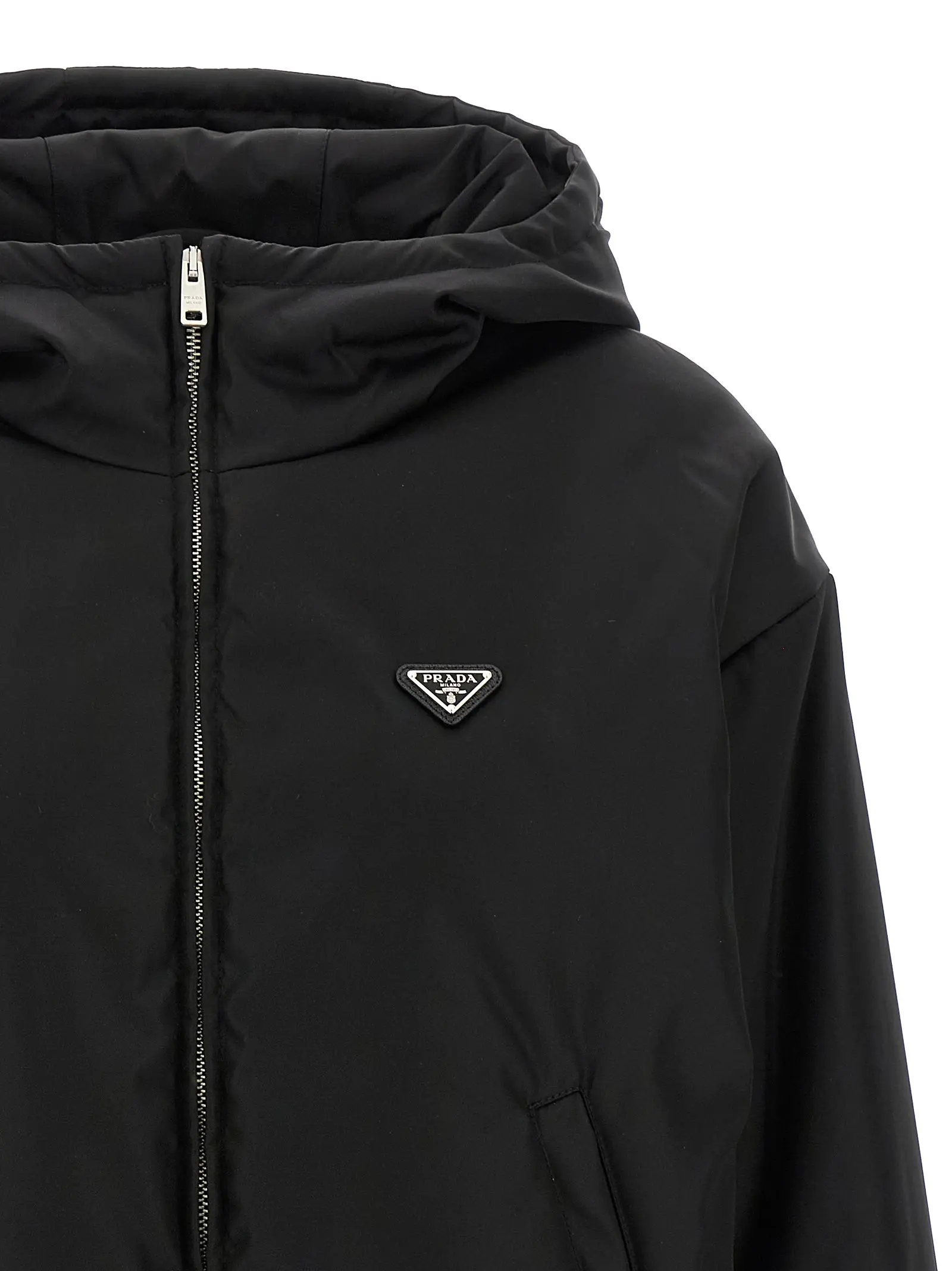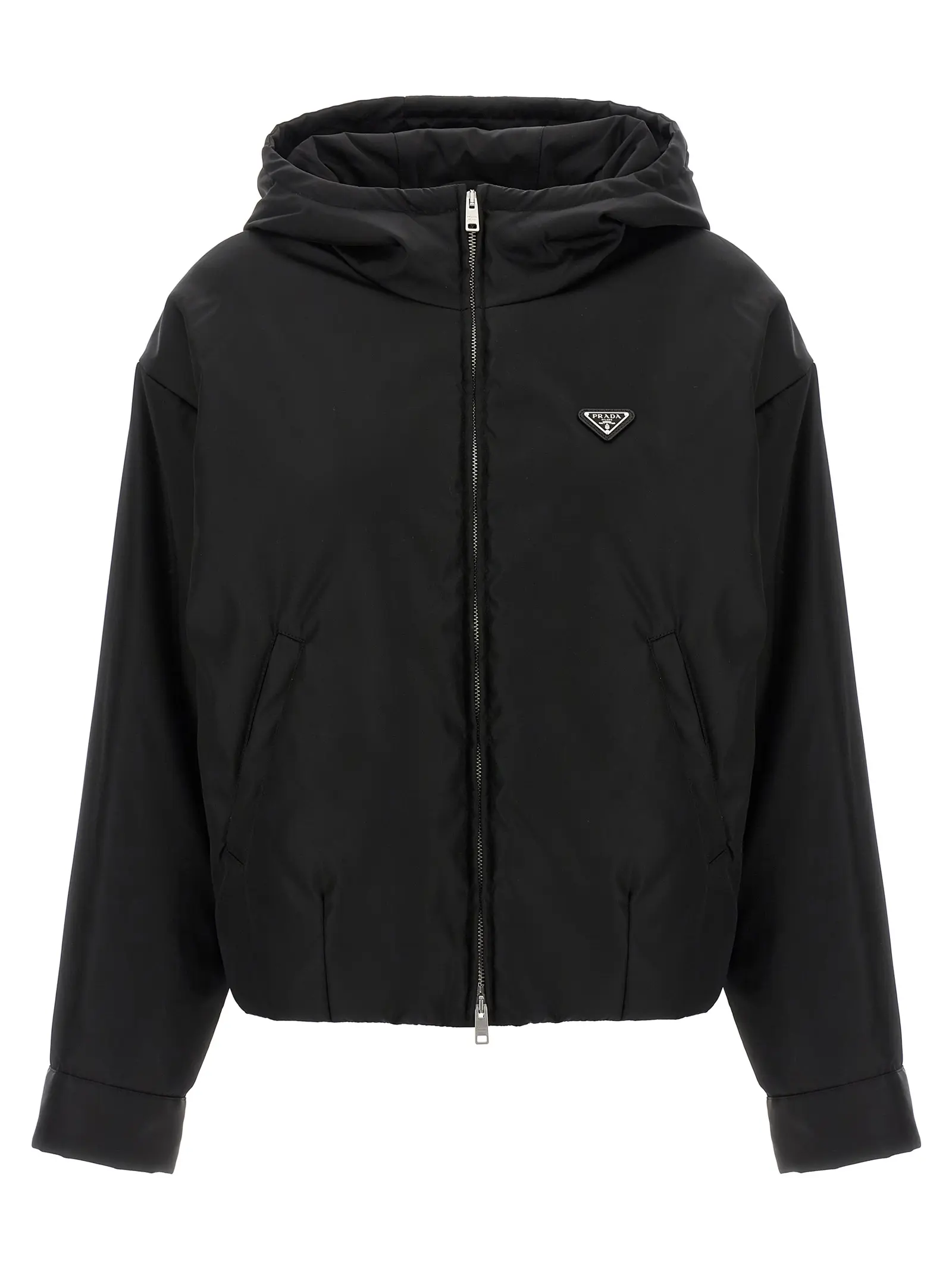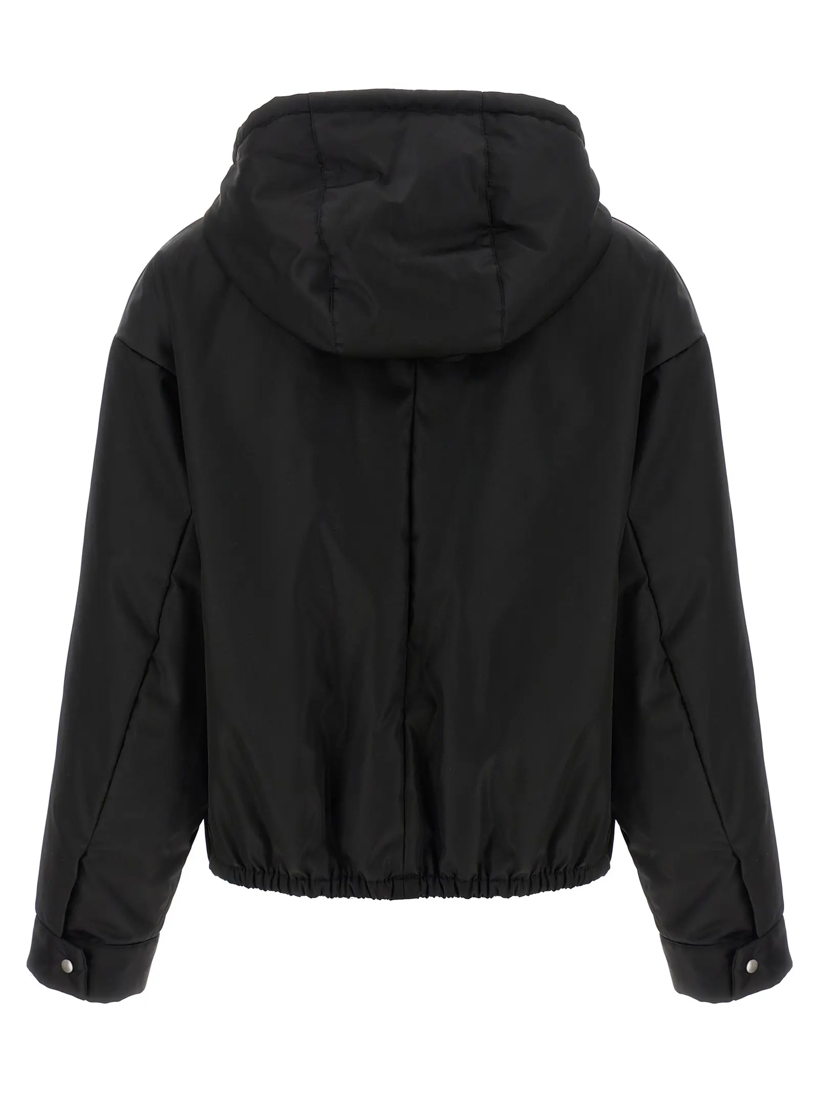 Чорна жіноча куртка з капюшоном виготовлена з інноваційної переробленої поліамідної нитки Re-Nylon, що підкреслює відповідальність за довкілля. Елегантний дизайн зі шкіряними манжетами, функціональними кишенями та блискавкою спереду додає універсальність і стиль, створюючи образ високого статусу та сучасної моди.