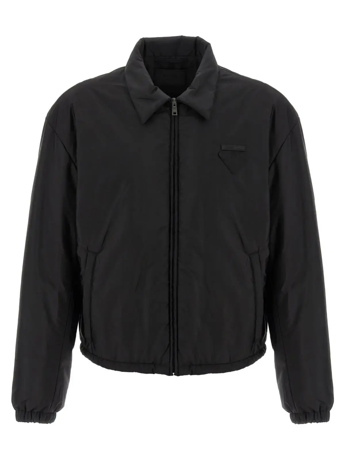Чорна чоловіча куртка Prada з легким утепленням виготовлена з інноваційного переробленого нейлону Re-nylon, що підкреслює екологічну відповідальність бренду. Витончений дизайн із коміром-сорочкою, логотипом у тон тканини та практичними деталями забезпечує універсальність, комфорт і неперевершений статус у сучасному стилі.