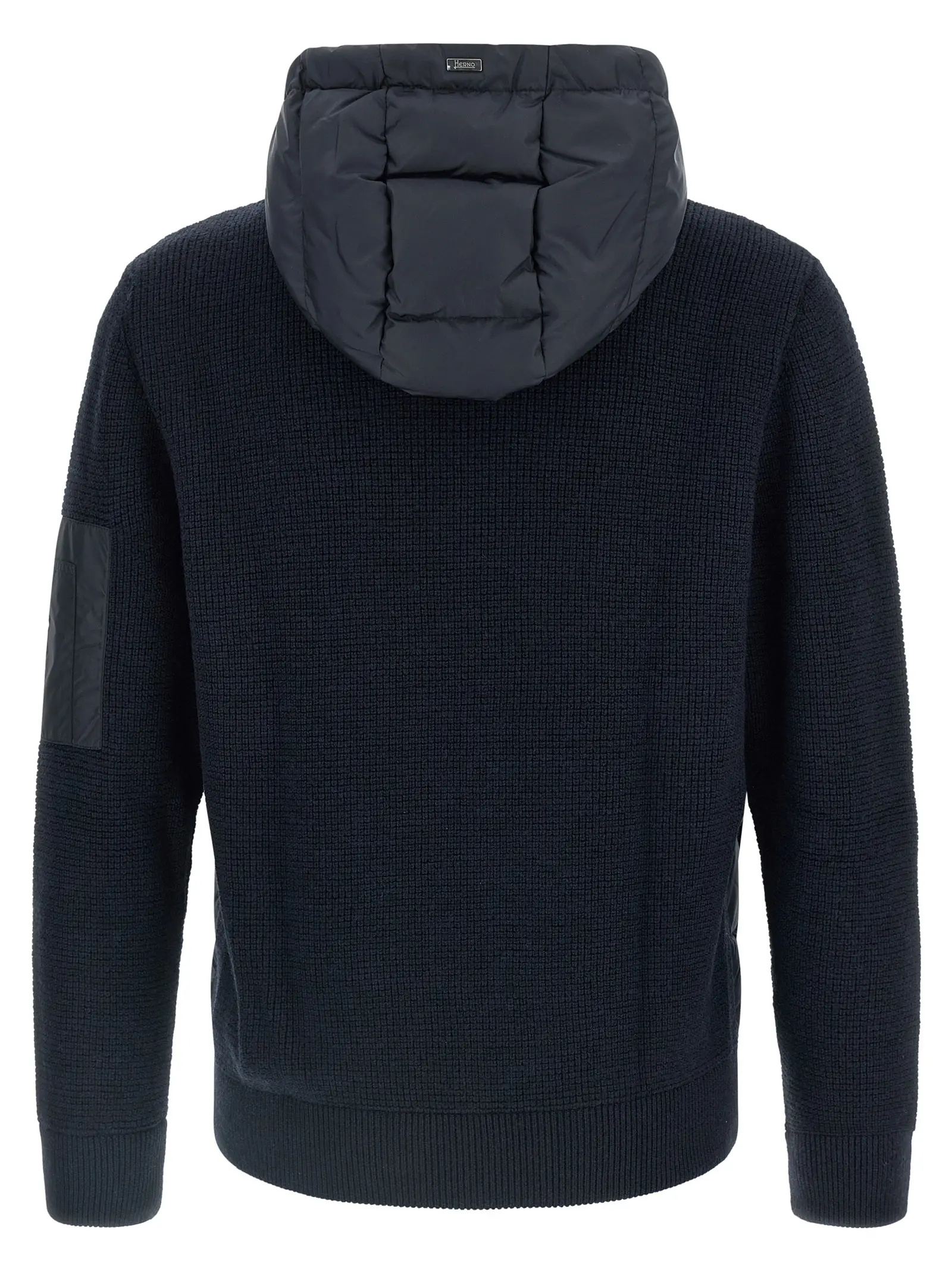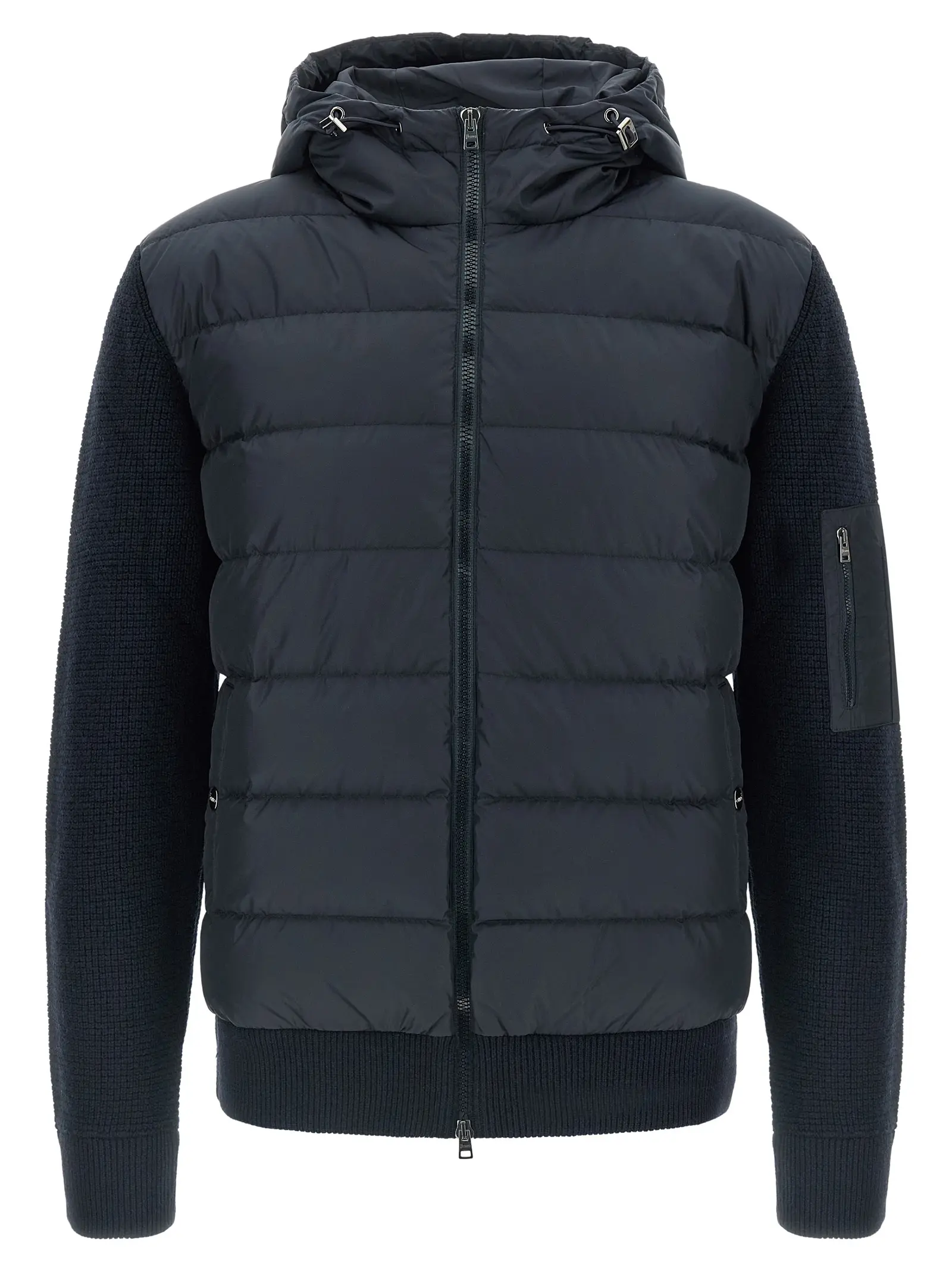 Пуховик із комбінованих матеріалів нейлон та вовняна в’язка. Є капюшон. Застібається на блискавку спереду. Має стьобану структуру. Оснащений передніми кишенями. Рукави довгі з манжетами. Виготовлений із 100% вовни.