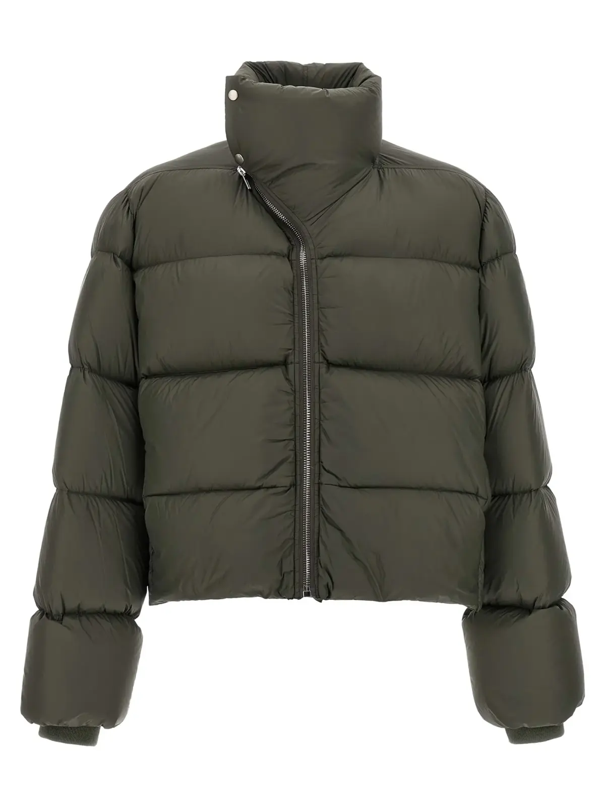 Пухова куртка сірого кольору з асиметричною застібкою на блискавку, виконана з високоякісного нейлону з наповненням із натурального гусячого пуху, поєднує інноваційний дизайн із функціональністю. Витончені деталі, такі як стоячий комір, еластичні манжети та декоративний бавовняний ремінець із заклепками, підкреслюють статус і бездоганний стиль, роблячи цей виріб універсальним вибором для сучасного чоловіка.
