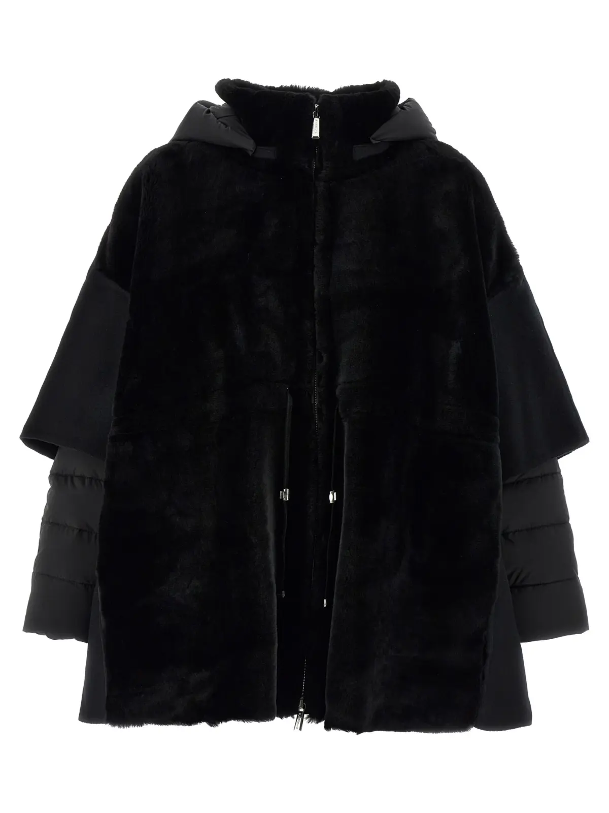 Шкіряна куртка з овчини. Капюшон з регульованими рукавами на ґудзиках. Внутрішня куртка з утепленою підкладкою і знімними рукавами на блискавці. Знімний стьобаний капюшон. Передня застібка на блискавку. Регульований пояс зі шнурком. Бічні кишені. Матеріал 100% шкіра овеча.