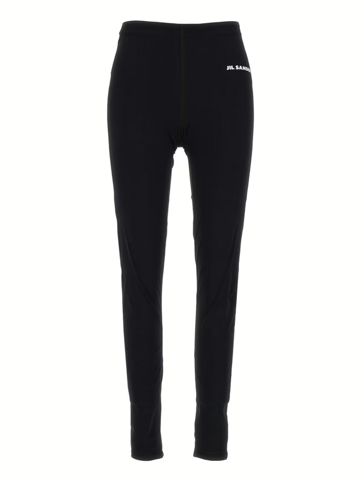 Леггінси з логотипом Jil Sander в чорному кольорі для жінок. Виготовлені з еластичної технічної тканини з принтом логотипу спереду та еластичною талією. Склад: 72% поліамід, 28% еластан.