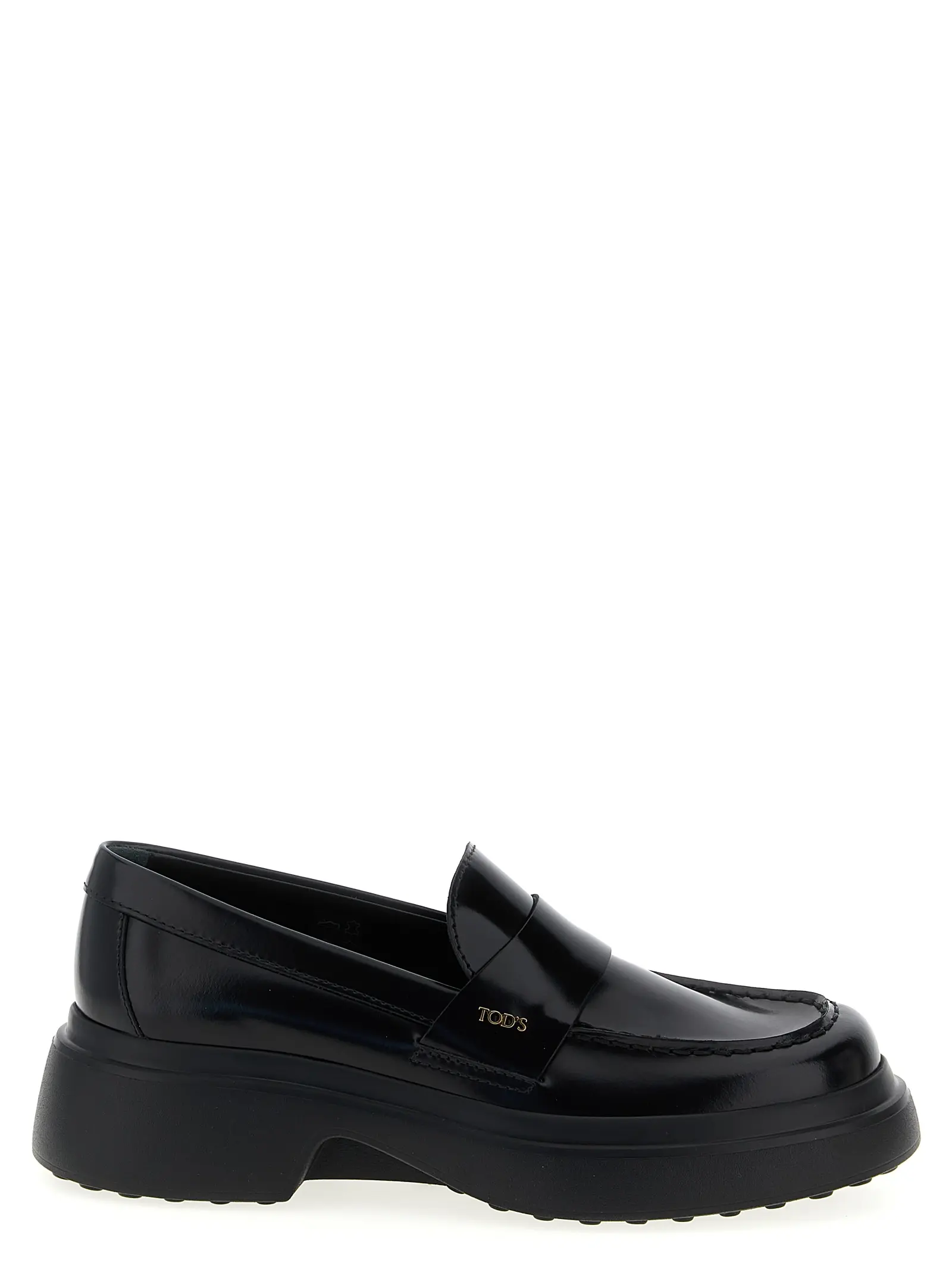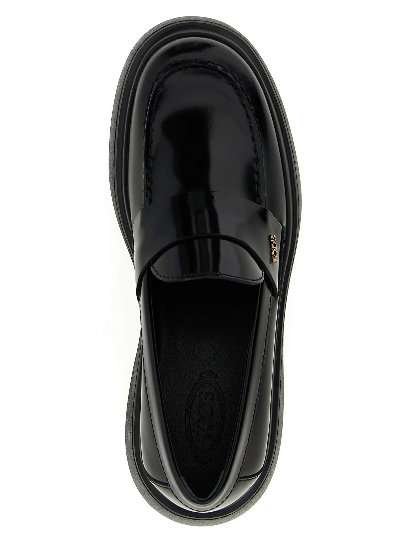 Чорні жіночі лофери з шліфованої телячої шкіри преміум якості, оснащені металевим лого збоку та масивною гумовою підошвою з тисненими вставками, поєднують інноваційний дизайн і неперевершений комфорт, підкреслюючи вишуканий стиль і статус власниці.