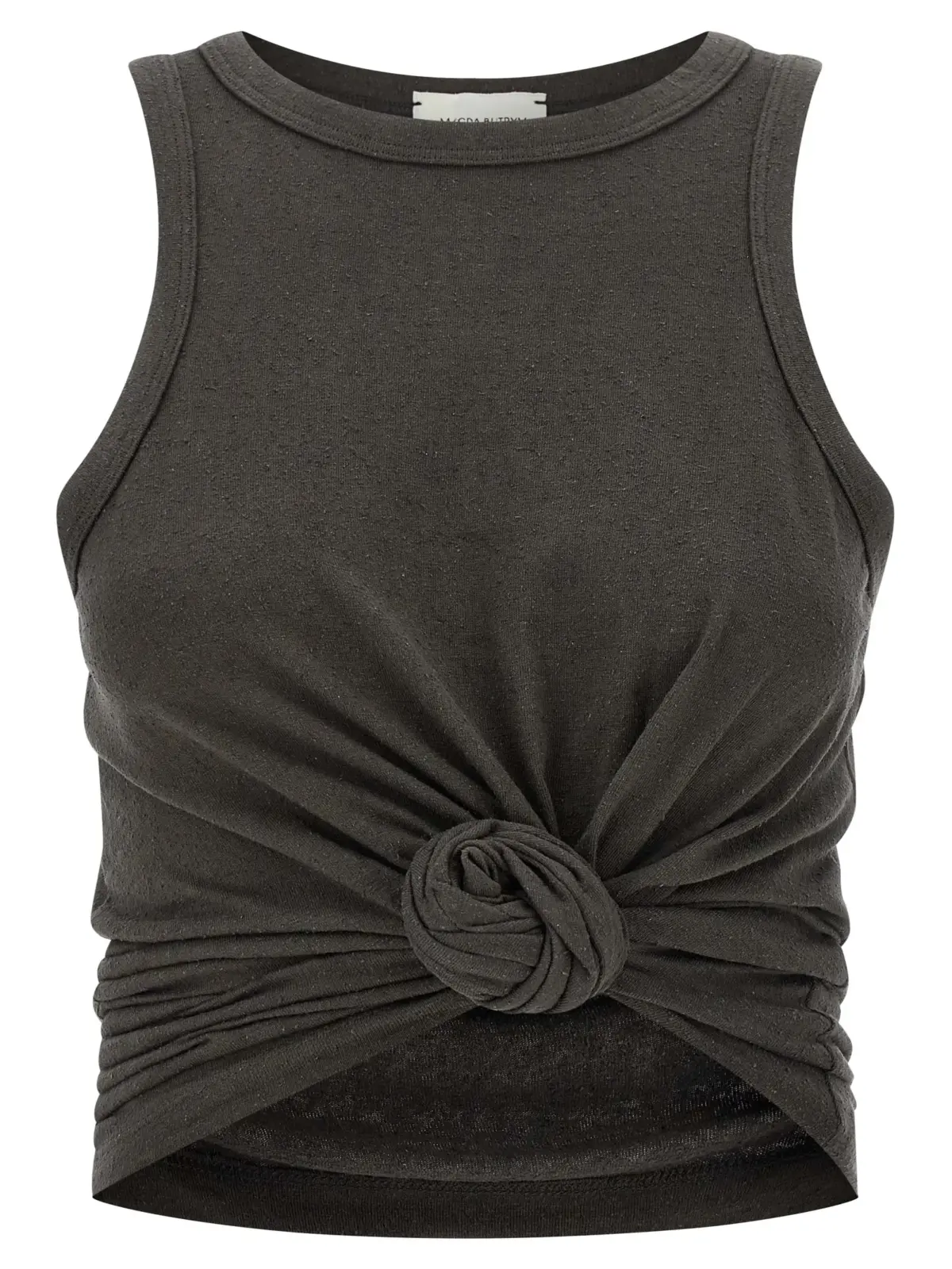 Ця жіноча майка сірого відтінку виготовлена з високоякісної суміші бавовни та шовку, що забезпечує неперевершений комфорт і дихаючі властивості. Вишуканий дизайн з округлим вирізом і декоративним вузлом спереду підкреслює інноваційність і стиль, надаючи образу вишуканої елегантності та універсальності.