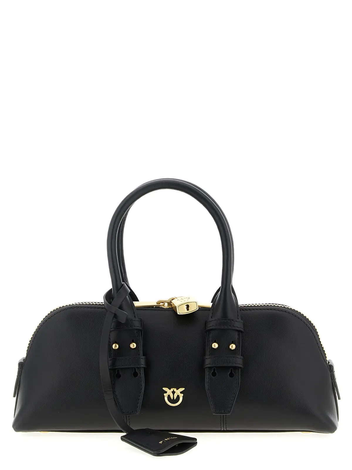 Маленька сумка боулінг із натуральної шкіри. Металевий логотип у вигляді птахів спереду та вишивка ззаду. Подвійний регульований ремінець. Верхня застібка на блискавку з деталлю у вигляді замка. Жорстке дно з металевими ніжками. Внутрішня підкладка з бавовни. Знімний декоративний підвісок. Регульований та знімний плечовий ремінь. Виготовлена зі 100% козячої шкіри.
