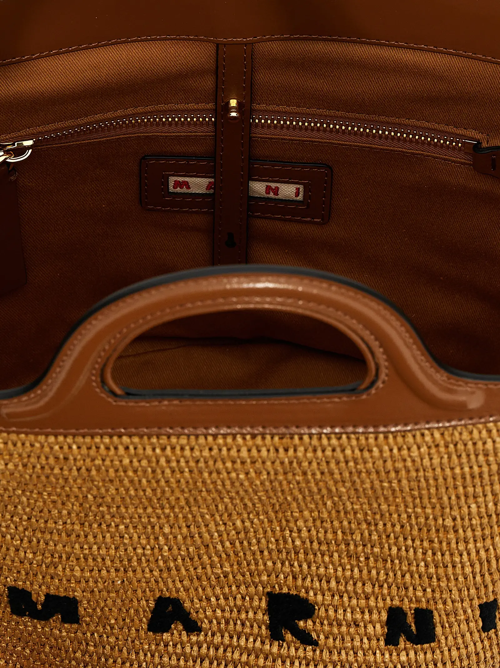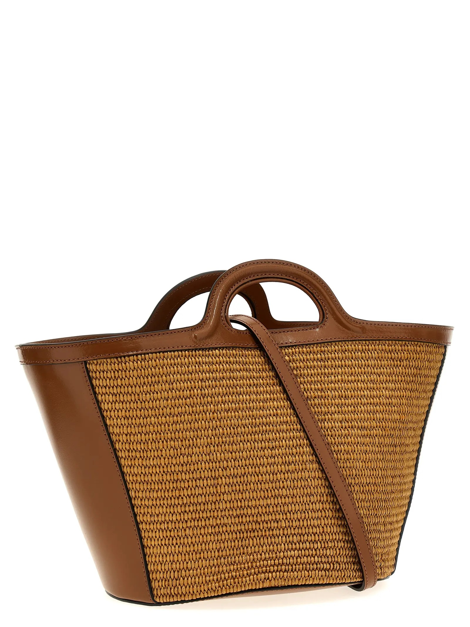 Сумка виготовлена з рафії та телячої шкіри. Є контрастна вишивка логотипу на передній частині. Має подвійні ручки. Закривається на гачок. Плечовий ремінь з шкіри регулюється та знімається. Матеріал тканини складається з 52% бавовни та 48% поліаміду.