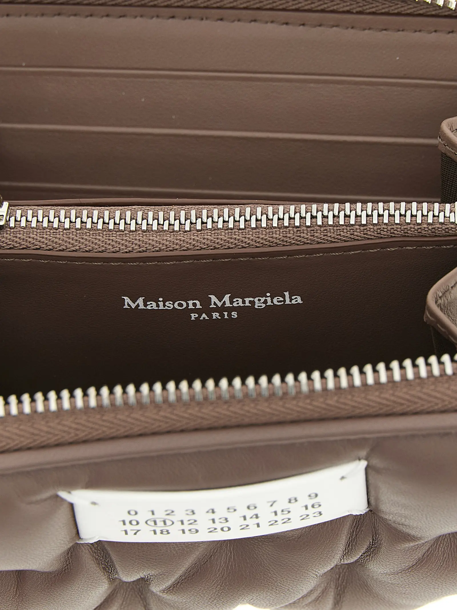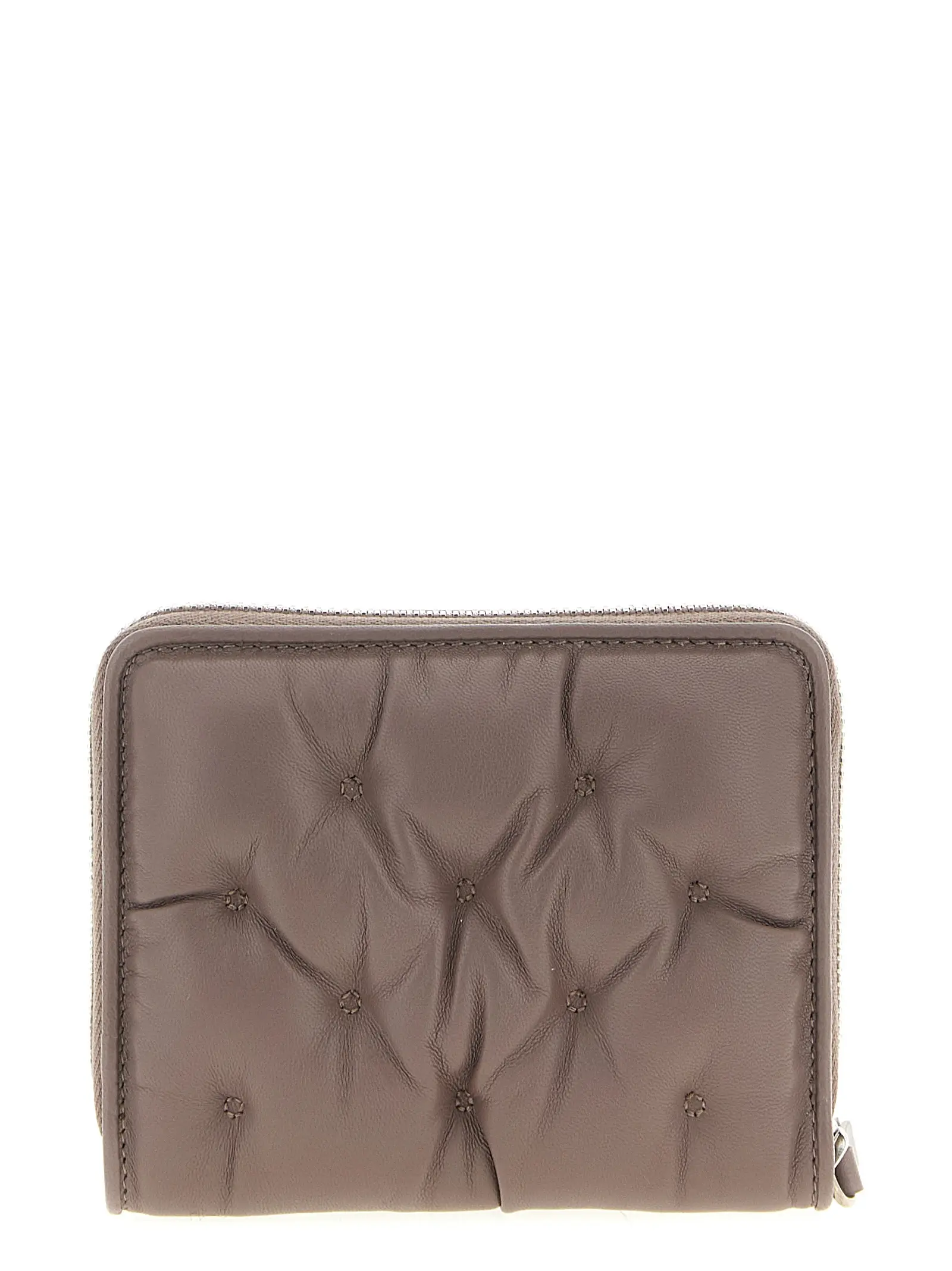 Маленький гаманець з мателассе ефектом. Матеріал – натуральна теляча шкіра. Застібка-блискавка по периметру. Спереду нашивка з цифровим підписом MM6. Текстура нагадує ручну стьобану тканину Марселя.
