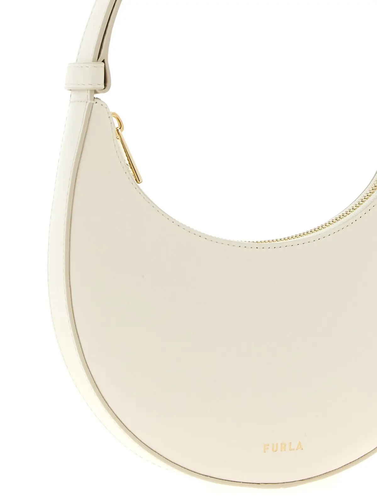 Міні-сумка Furla Delizia білого кольору виготовлена з натуральної шкіри найвищої якості, що дарує ніжність та шовковистість на дотик. Жорстка півмісяцеподібна форма, витончене тиснення логотипу спереду та надійна застібка на блискавку підкреслюють інноваційний дизайн і функціональність, а регульований ремінець із металевим механізмом додає універсальності. Цей аксесуар втілює статус і бездоганний стиль для впевнених у собі жінок.