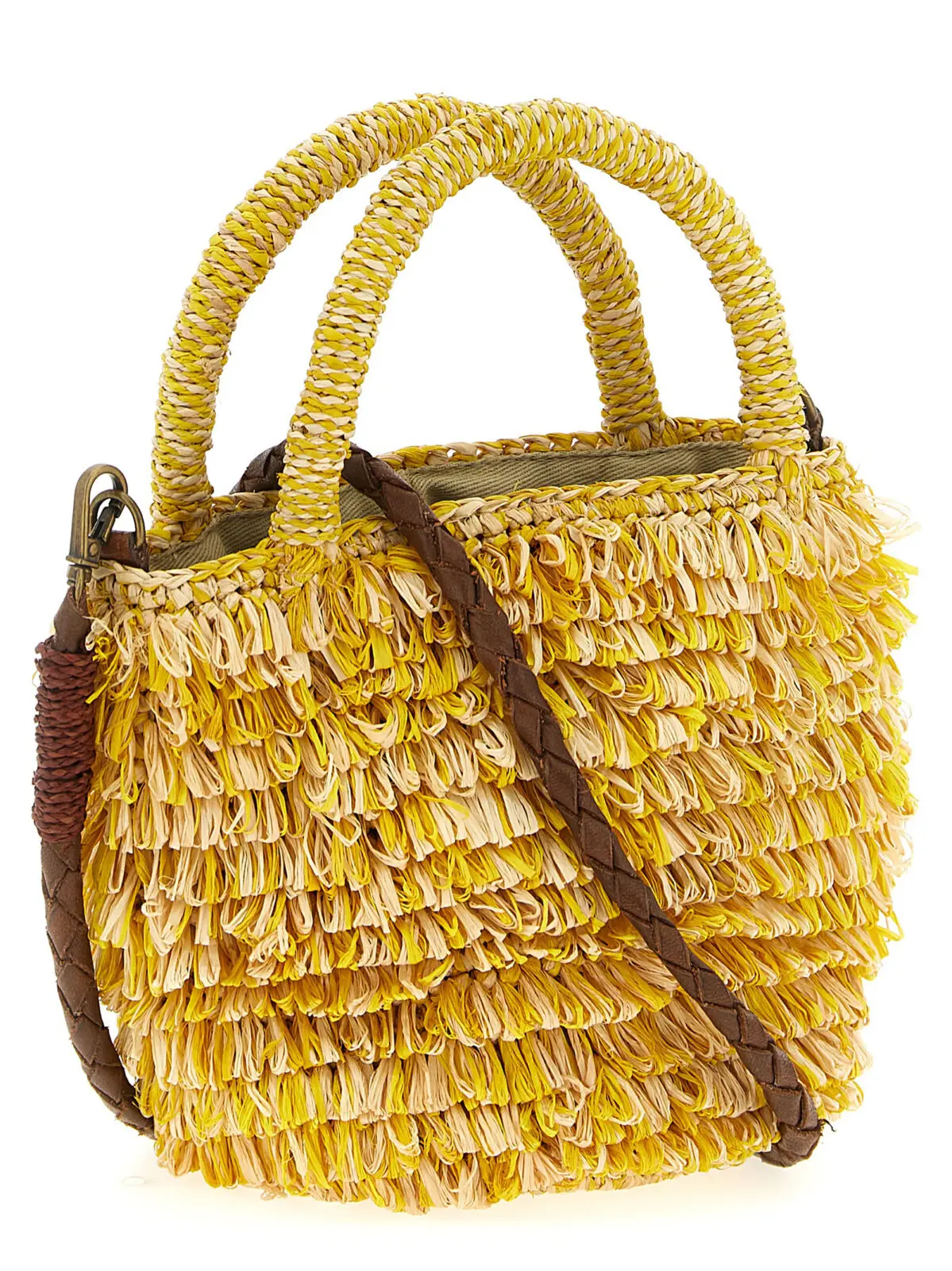 Міні-сумка Naka виконана вручну з натуральної рафії, що підкреслює її унікальність та екологічність. Витончений дизайн із затягуючим мішечком, подвійною ручкою та знімним плетеним шкіряним ремінцем забезпечує комфорт і універсальність, створюючи образ вишуканого статусу та бездоганного стилю.