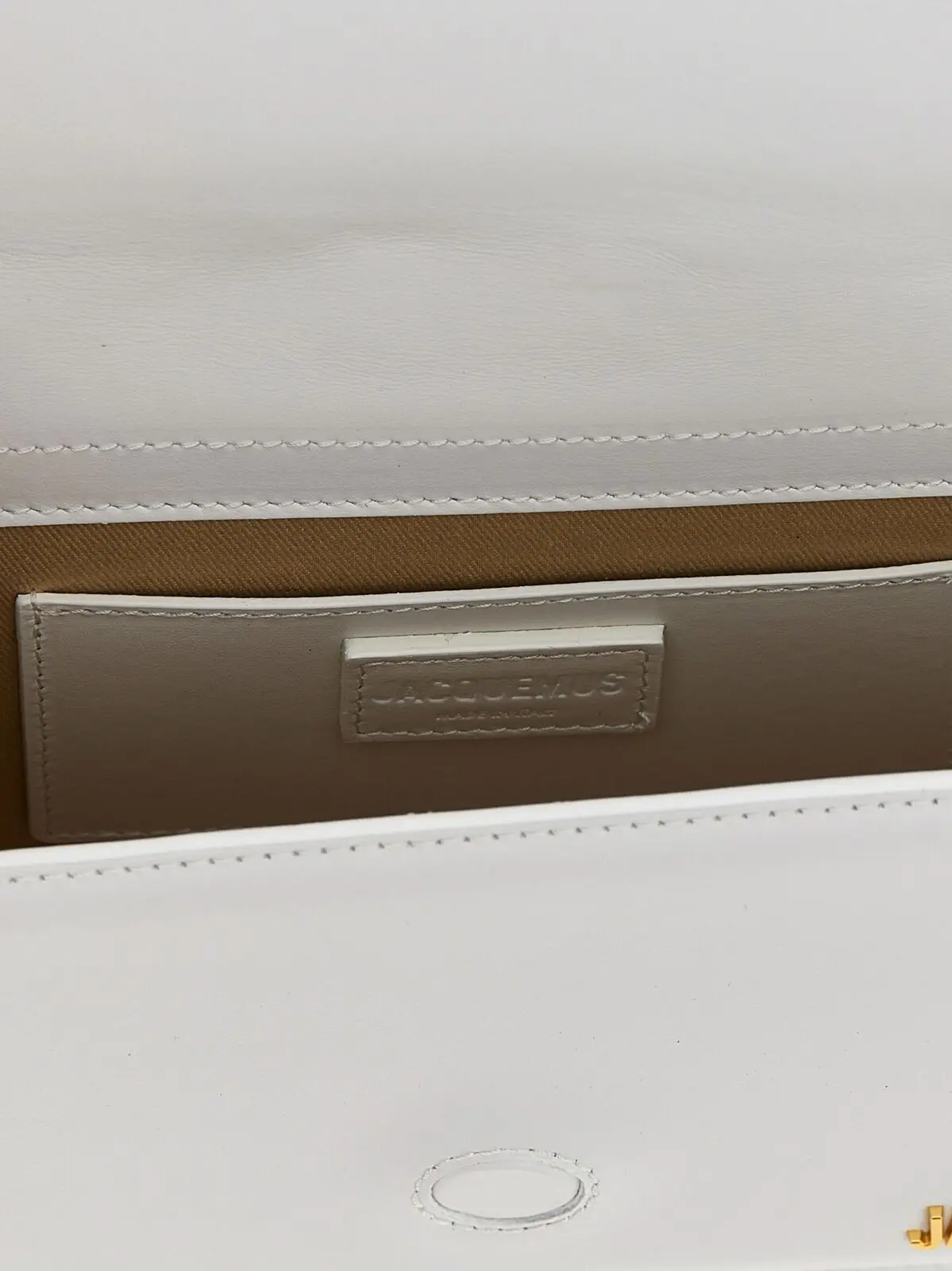 Міні-сумка Le Grand Bambino білого кольору виготовлена з високоякісної натуральної шкіри великої рогатої худоби, поєднує витончений дизайн із функціональністю завдяки магнітній застібці, металевому логотипу та регульованому знімному ремінцю, підкреслюючи статус і бездоганний стиль сучасної жінки.
