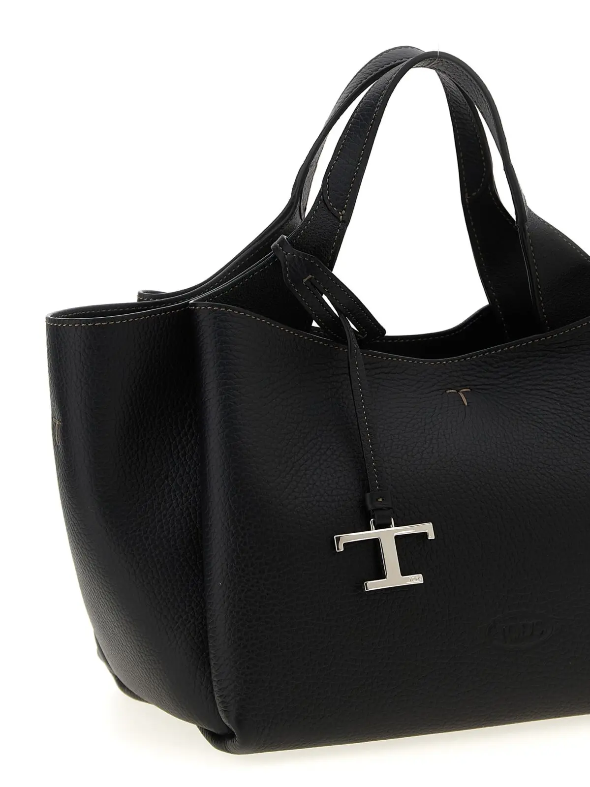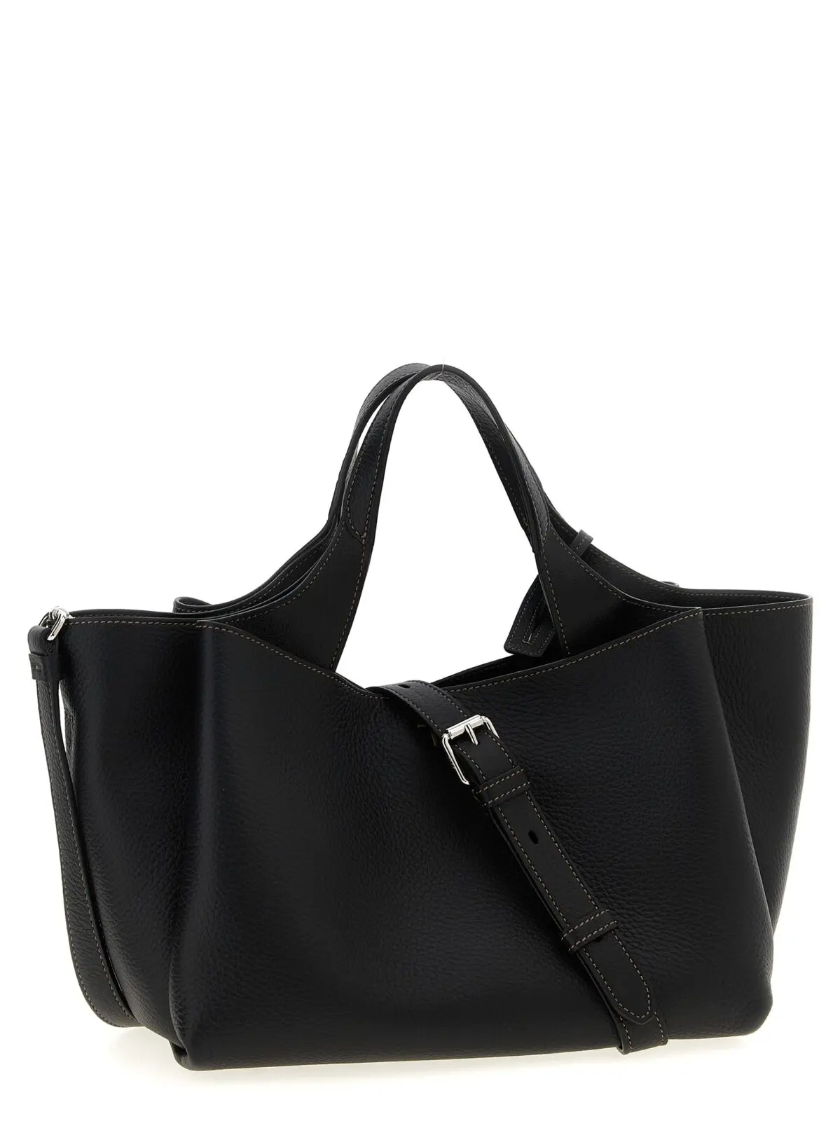 Міні-сумка з зернистої шкіри теляти чорного кольору вирізняється вишуканою текстурою та витонченим тисненим логотипом спереду, тональним швом та металевими деталями. Елегантний дизайн з подвійною ручкою і регульованим плечовим ременем поєднує стиль і функціональність, надаючи образу статус і неперевершену універсальність.