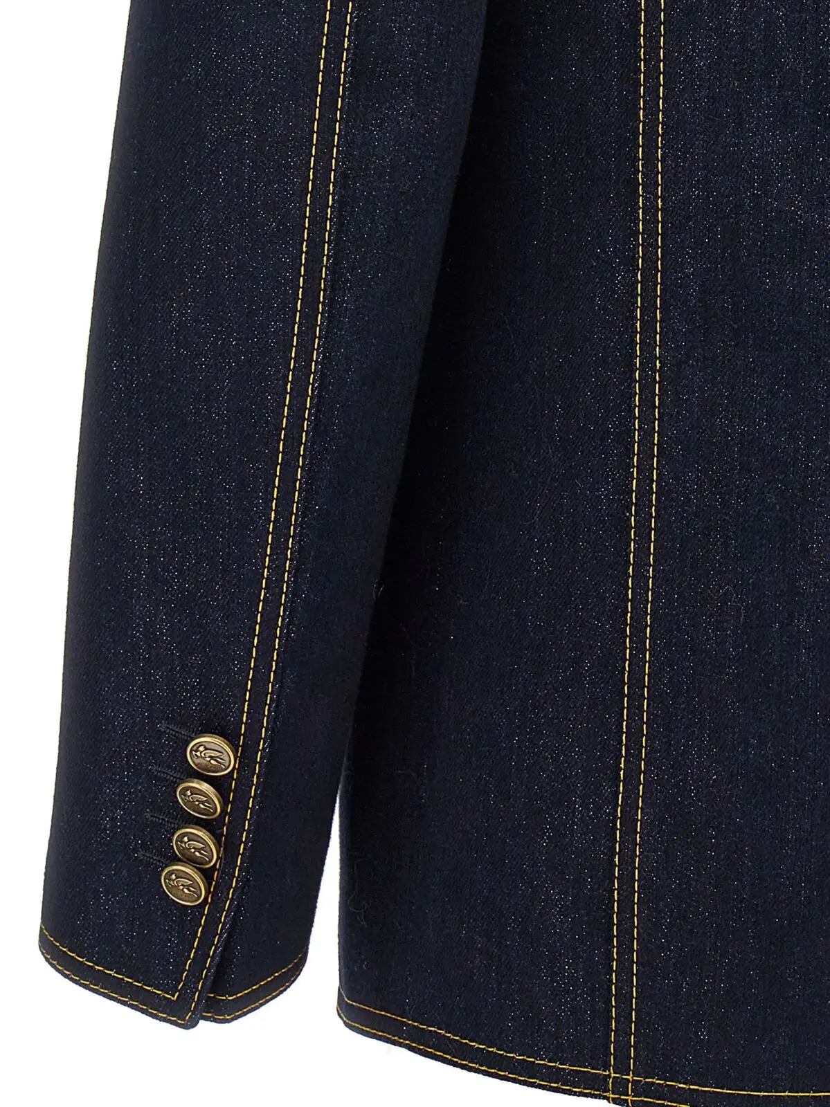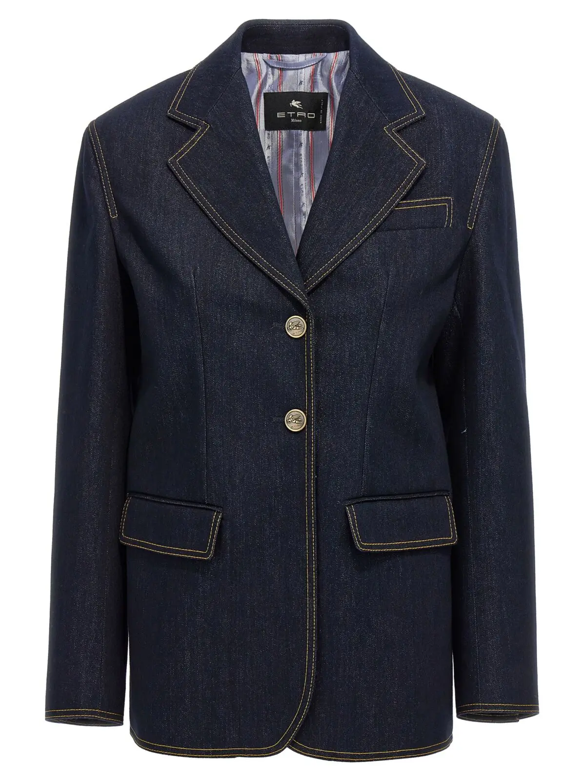 Цей однобортний джинсовий блейзер Etro вишуканого синього кольору стане справжньою знахідкою для вашого гардеробу, втілюючи елегантність і статус. Виконаний з високоякісних матеріалів, у складі яких 70% бавовни, 20% віскози та 10% льону, блейзер забезпечує комфорт і стиль у будь-якій ситуації. Його класичний дизайн з кнопковою застібкою, функціональними кишенями та довгими рукавами підкреслює жіночність, а підкладка на плечах та розріз на спині додають елегантності. Цей блейзер ідеально поєднується як із діловими, так і з повсякденними образами, гарантуючи універсальність у використанні. Обираючи цей виріб, ви обираєте не лише якість і інноваційність, а й стиль, який підкреслить вашу індивідуальність та впевненість. Вражаючий акцент у вашому вигляді, він не залишить без уваги жодного оточуючого.