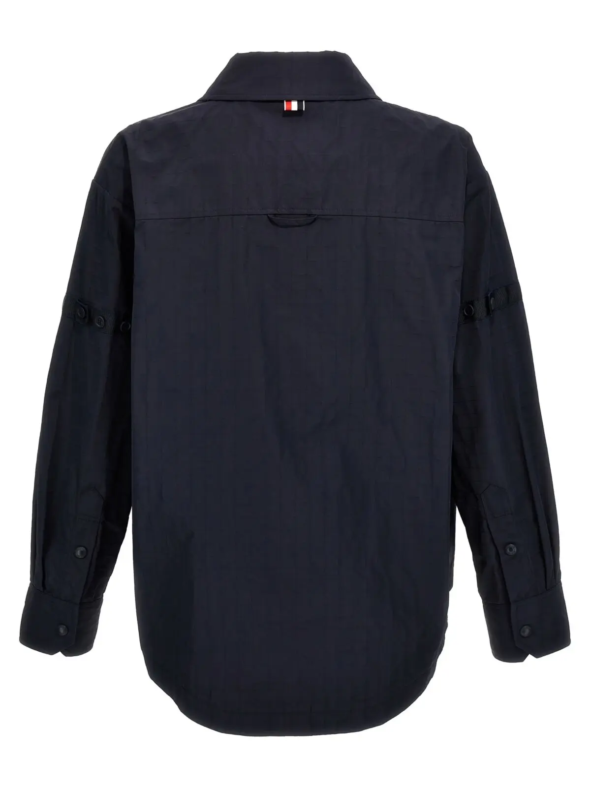 Чоловічий синій овершерт Snap Front від Thom Browne виготовлений з міцного рипстоп-нейлону. Модель має застібку на кнопки, кишені та довгі рукави з манжетами. Склад тканини становить 90% поліаміду та 10% поліуретану, що забезпечує високу зносостійкість та комфорт при носінні.