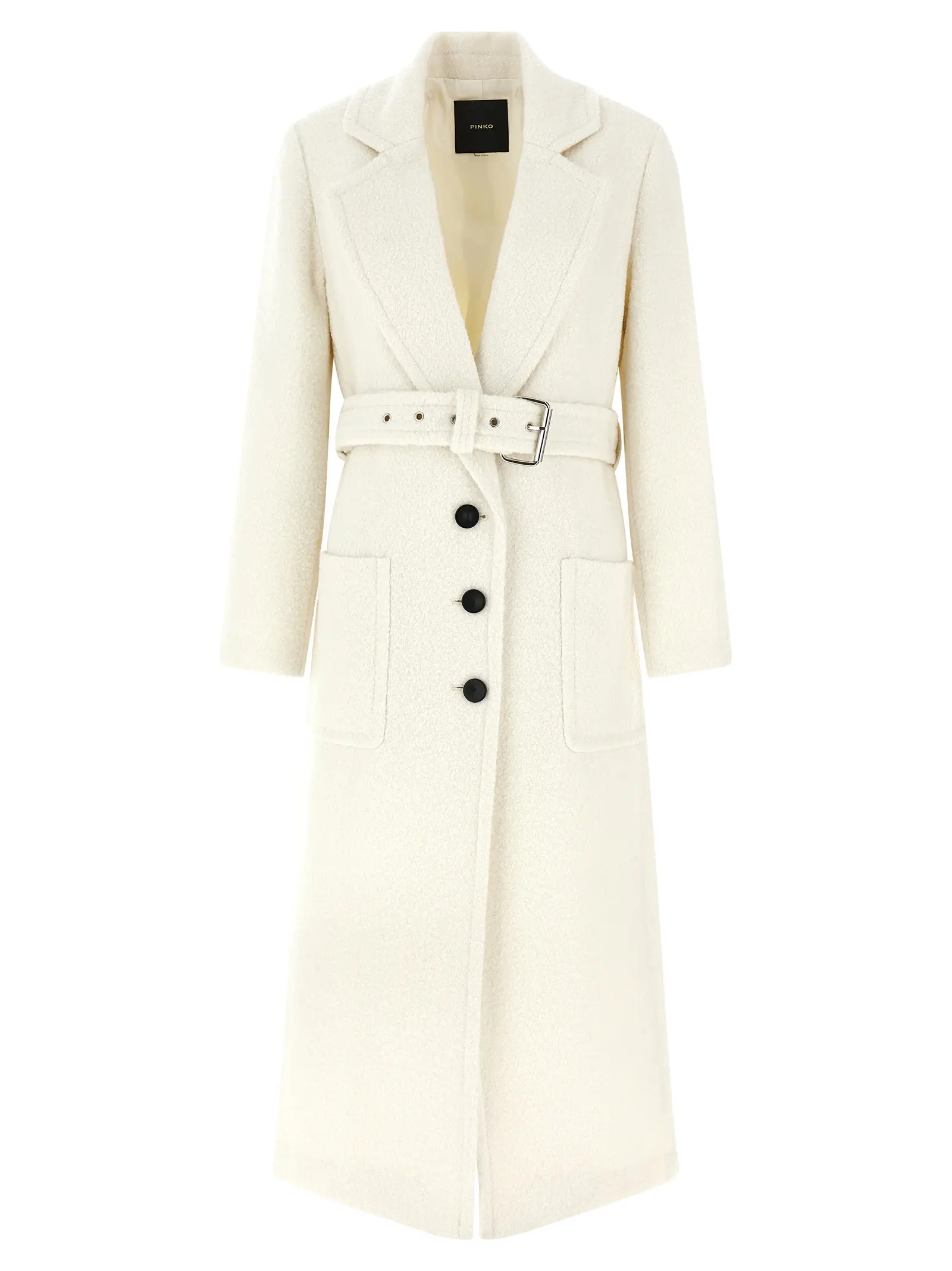 Елегантне жіноче пальто Cerfoglio від Pinko виготовлене з високоякісної діагональної букле вовняної суміші, що поєднує комфорт та стиль. Однобортний фасон із класичним відкладним коміром, практичними накладними кишенями та знімним поясом підкреслює вишуканість силуету, а віскозна підкладка забезпечує ідеальну посадку та легкість у носінні. Це пальто є ідеальним вибором для поціновувачів преміального модного образу, що цінують інновації та універсальність.