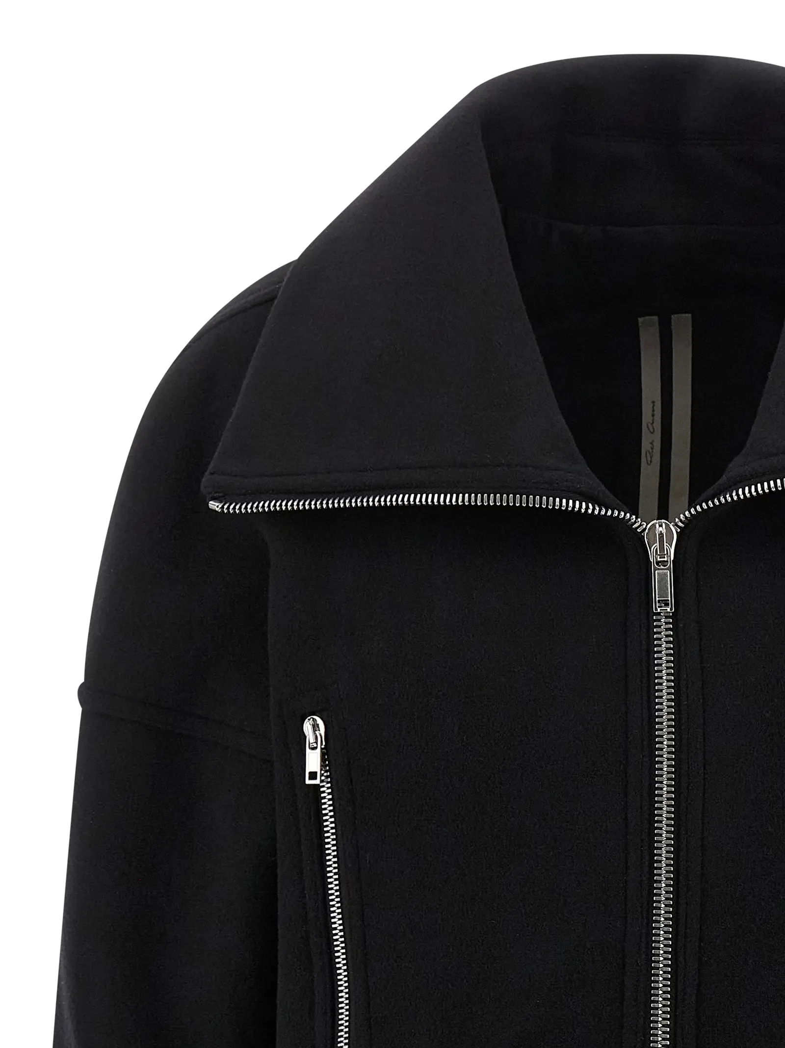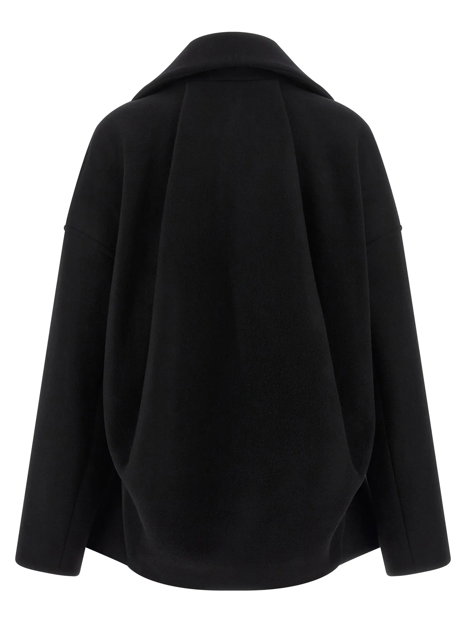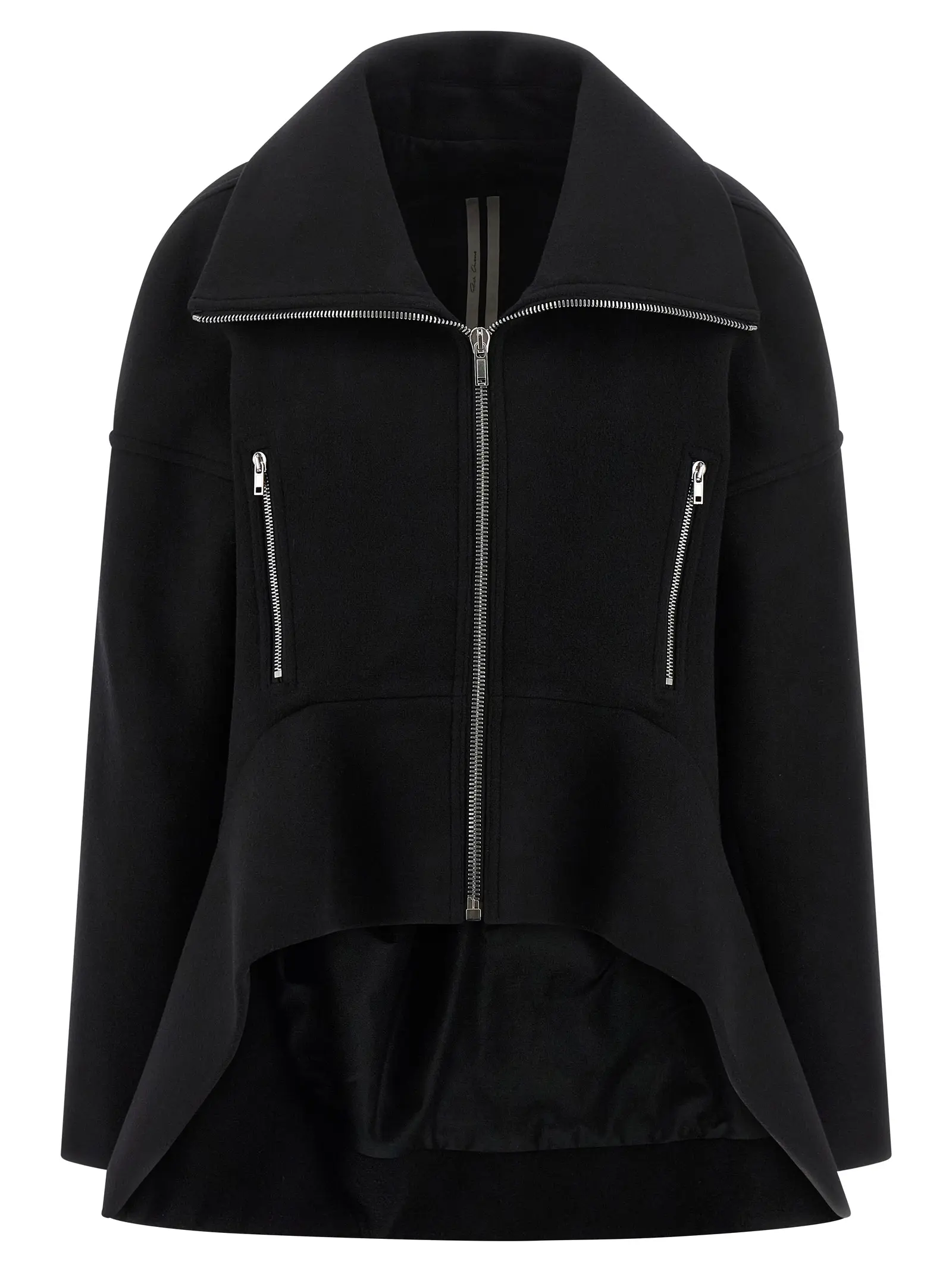 Чорне пальто з 100% нової вовни вирізняється елегантним асиметричним кроєм із піднятим вигнутим переднім краєм, що підкреслює інноваційний дизайн та стильний силует. Відкладний посилений високий комір додає шарму й статусності, а функціональна застібка на блискавку та практичні кишені забезпечують комфорт і універсальність у будь-яких умовах.