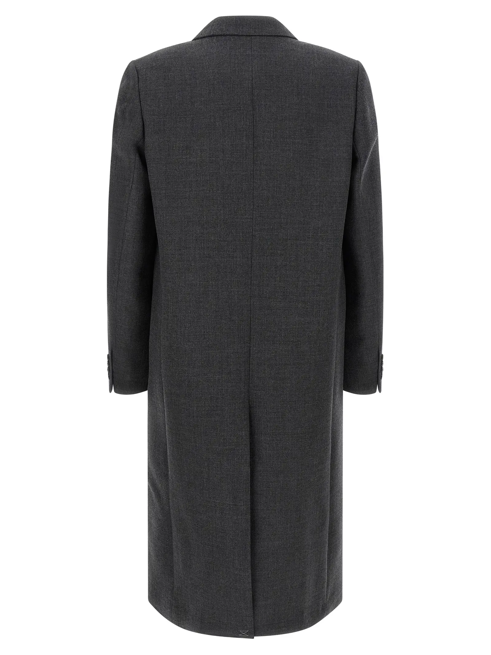 Пальто довге. Подвійне застібання на ґудзики. V-подібний виріз з гострими лацканами. Передні кишені. Центральний розріз ззаду. Довгі рукави з ґудзиками. Матеріал 100 відсотків вовна.