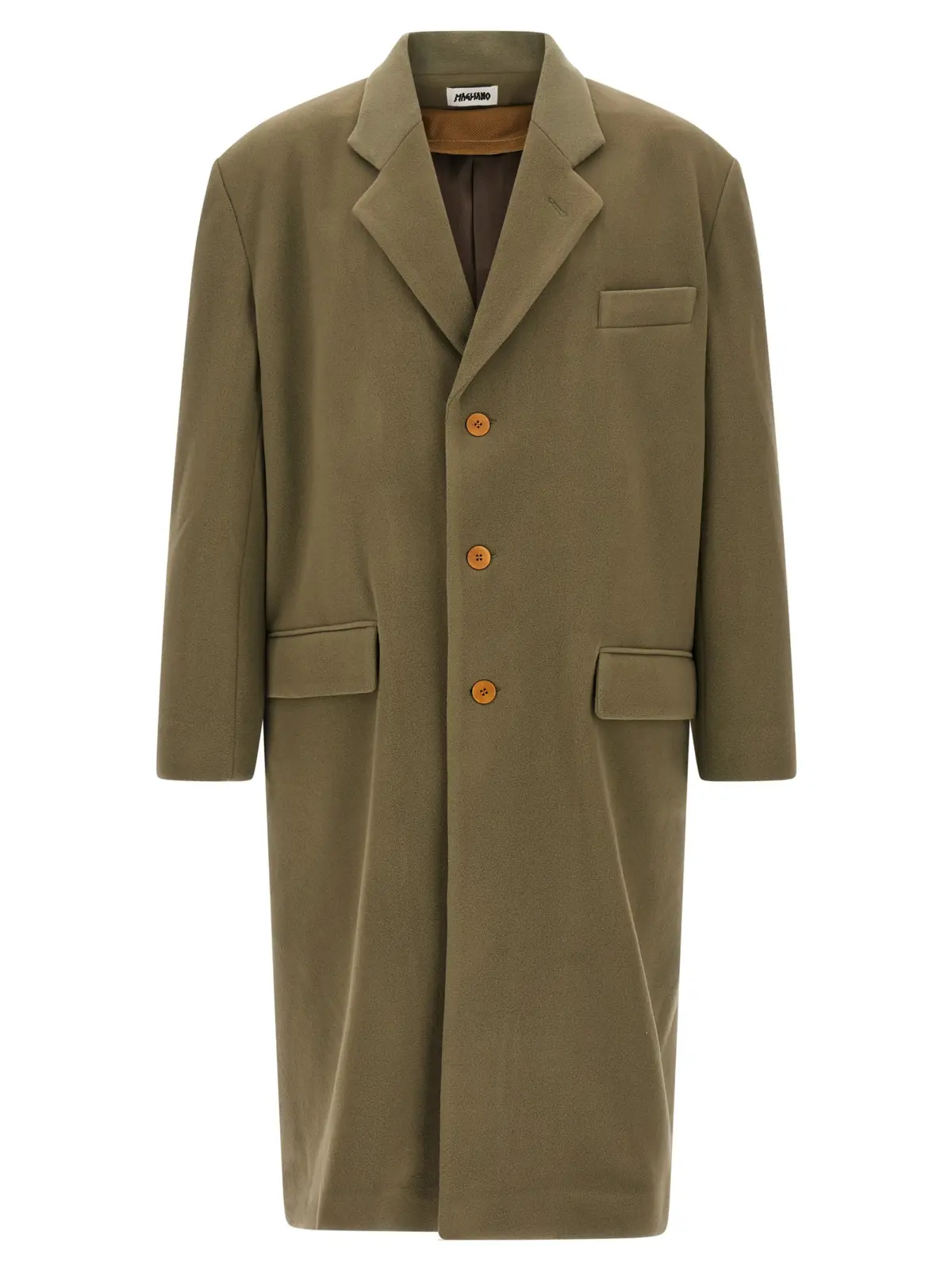Пальто однобортне з можливістю носіння з двох сторін. Виготовлено з вовни та віскози. Має функціональні вставки з флісу та сітки. Передбачена застібка на ґудзики або фронтальний закритий дизайн. Є лацкани. Оснащене кишенями. Має структуровані плечові деталі. Довгі рукави. Задній розріз.
