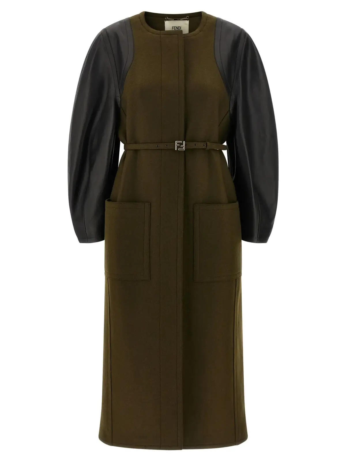 Вишукане пальто зеленої гами з м’якого вовняного фетру, доповнене довгими рукавами з натуральної шкіри, прихованою застібкою та елегантним ремінцем з регульованим і знімним логотипом. Поєднує інноваційний дизайн, бездоганну якість і універсальність, створюючи неперевершений образ статусу та стилю.