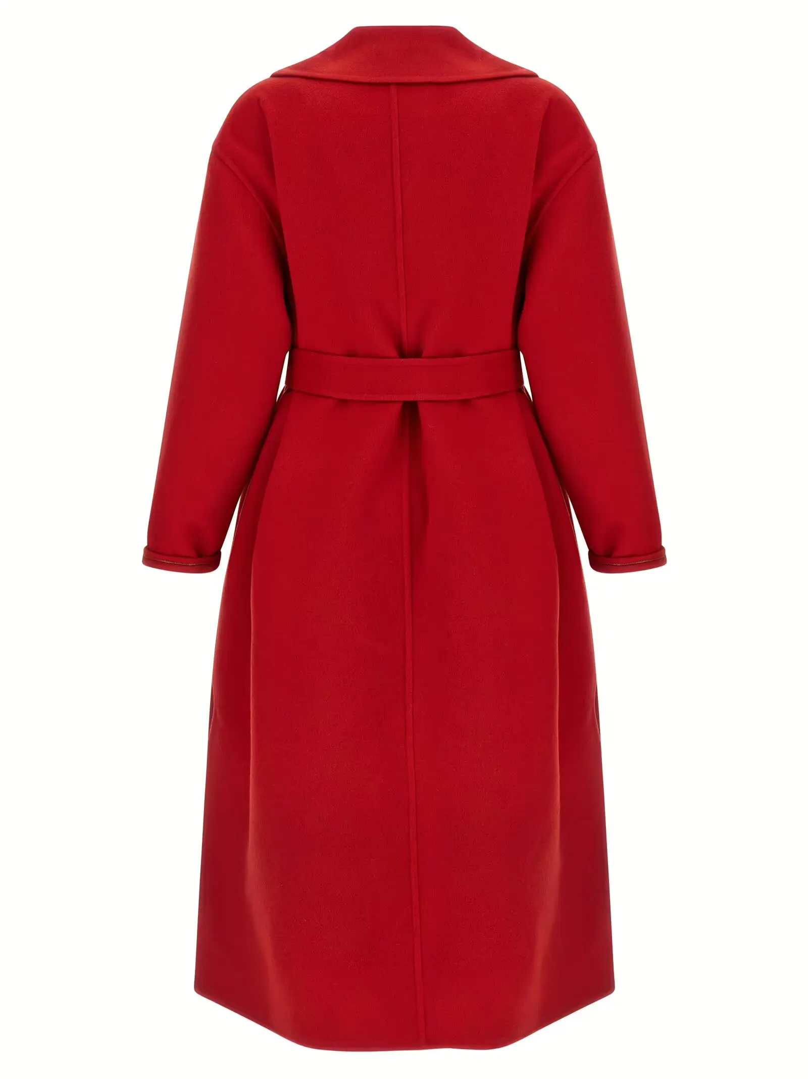 Вишукане жіноче пальто червоного кольору з поєднанням високоякісної шерсті мериноса та кашеміру, виконане в стилі халата з лацканним коміром, накладними кишенями та довгими рукавами з відворотами і вишуканою декоративною деталлю. Модель без підкладки, з боковими розрізами та знімним поясом, що підкреслює елегантність, статус і універсальність образу.