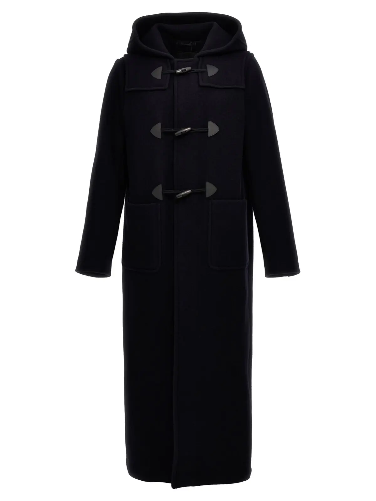 Чоловіче пальто Prada Long Montgomery з вовни, синього кольору, з застібкою на гудзики та застібкою-брязка, з капюшоном, кишенями, без підкладки. Виготовлене з 100% вовни.