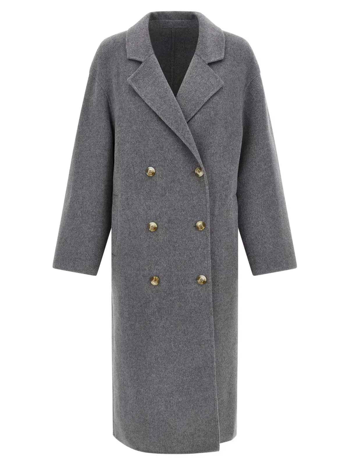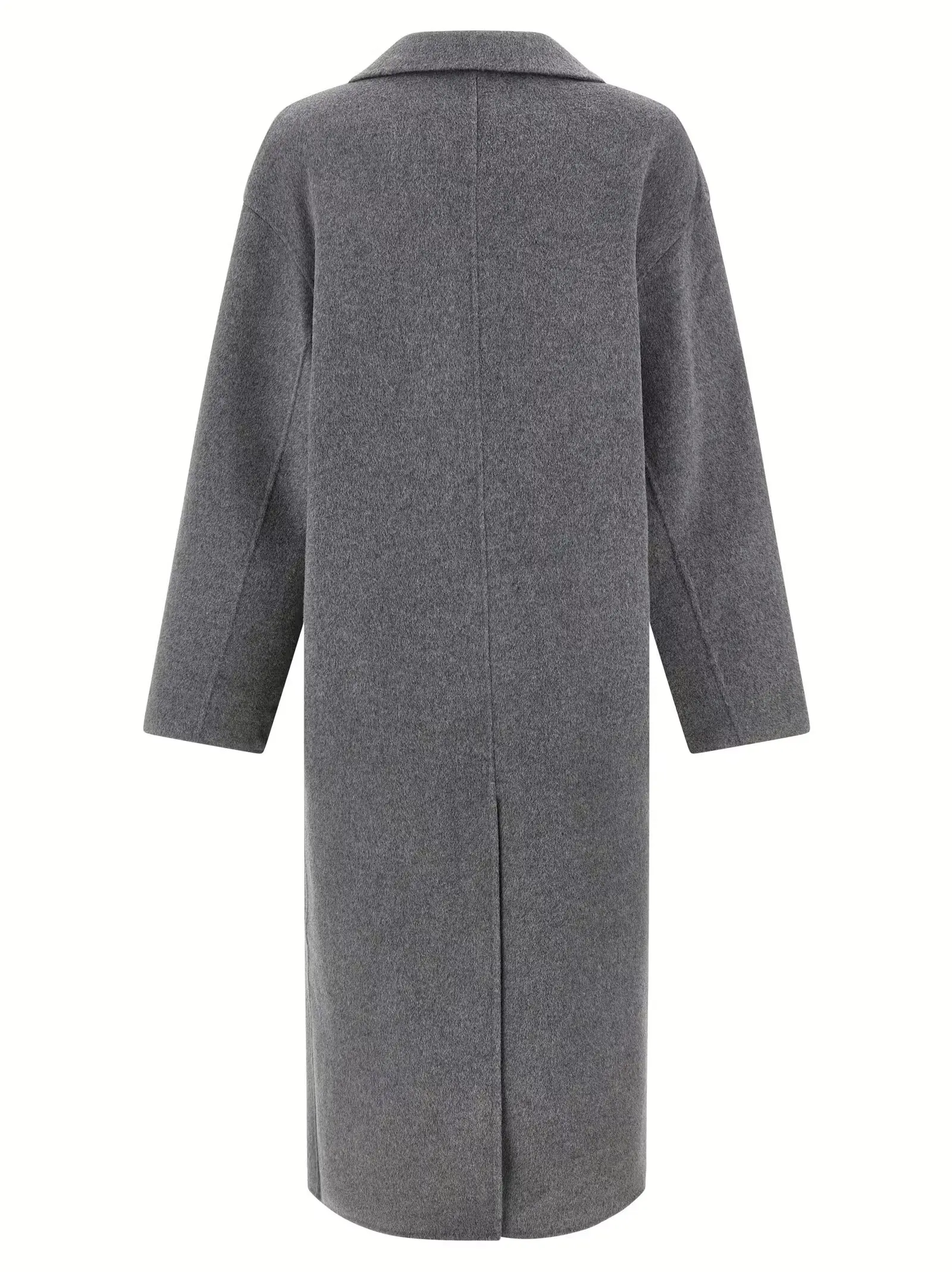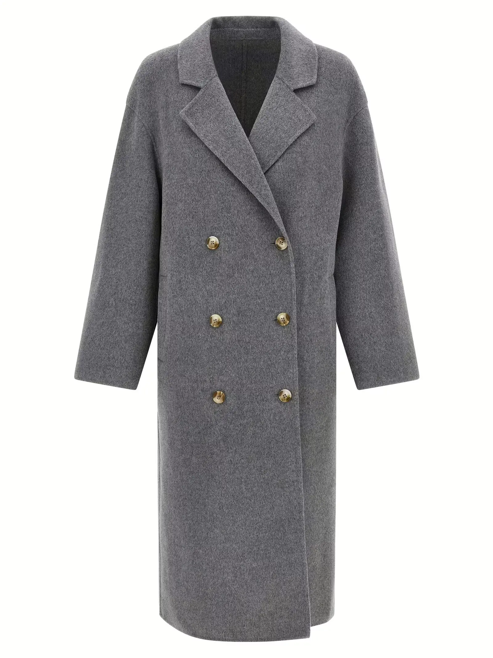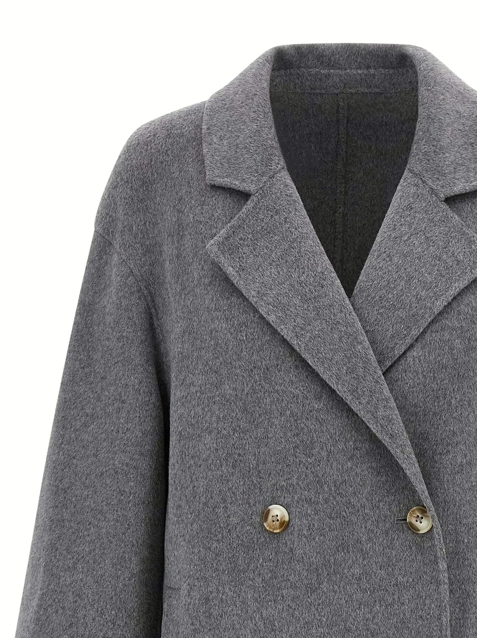 Це жіноче сіре пальто Borneo виготовлене з вишуканої суміші вовни та кашеміру, що забезпечує неперевершений комфорт і тепло. Двобортний фасон із дзеркальними лацканами, функціональними кишенями та розрізом на спинці поєднує елегантність і сучасний стиль, підкреслюючи статус та інноваційність образу.