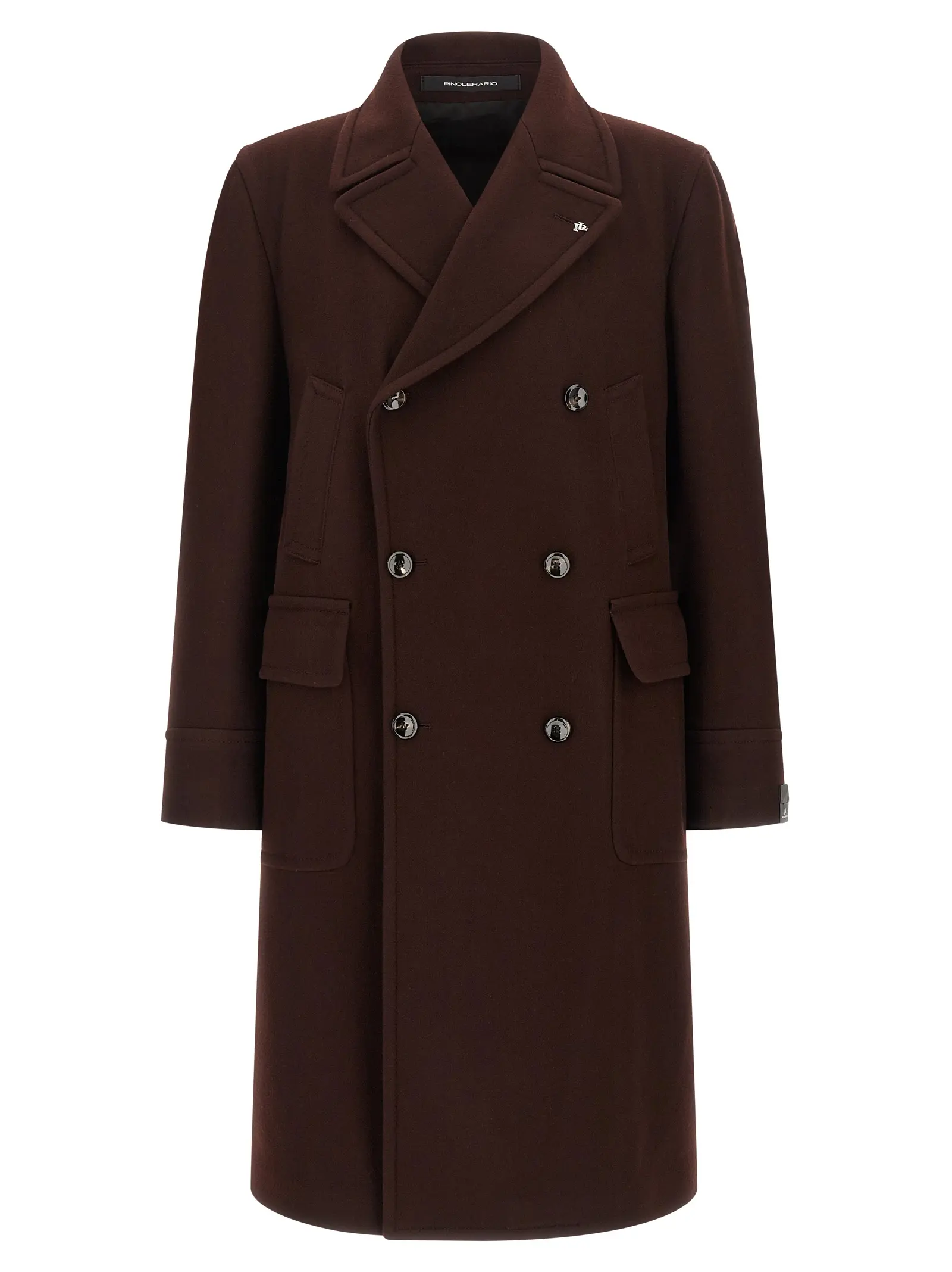 Пальто з двобортною застібкою. Модель виконана з суміші вовни та кашеміру. Передня застібка на ґудзики з рогу. Комір з шкіряною вставкою на спинці. Лацкани з віддзеркаленням та знімною металевою брошкою. Є кишені. Довгі рукави. Структуровані плечі. Задній розріз. Підкладка з напівкупро з монограмою. Дві внутрішні кишені. Тканини розроблені ексклюзивно для бренду. Склад тканини: 70% вовна, 20% поліамід, 10% кашемір.