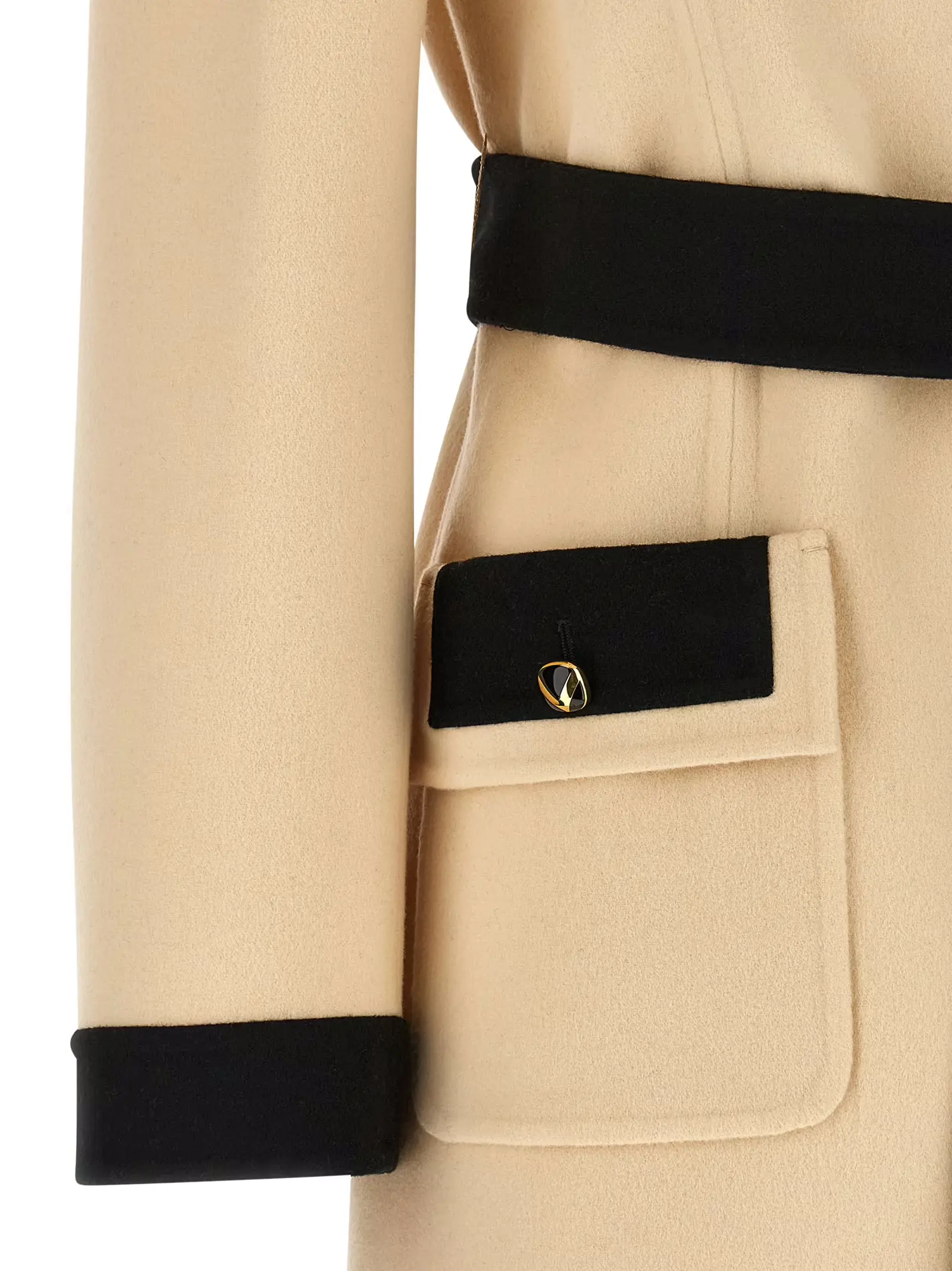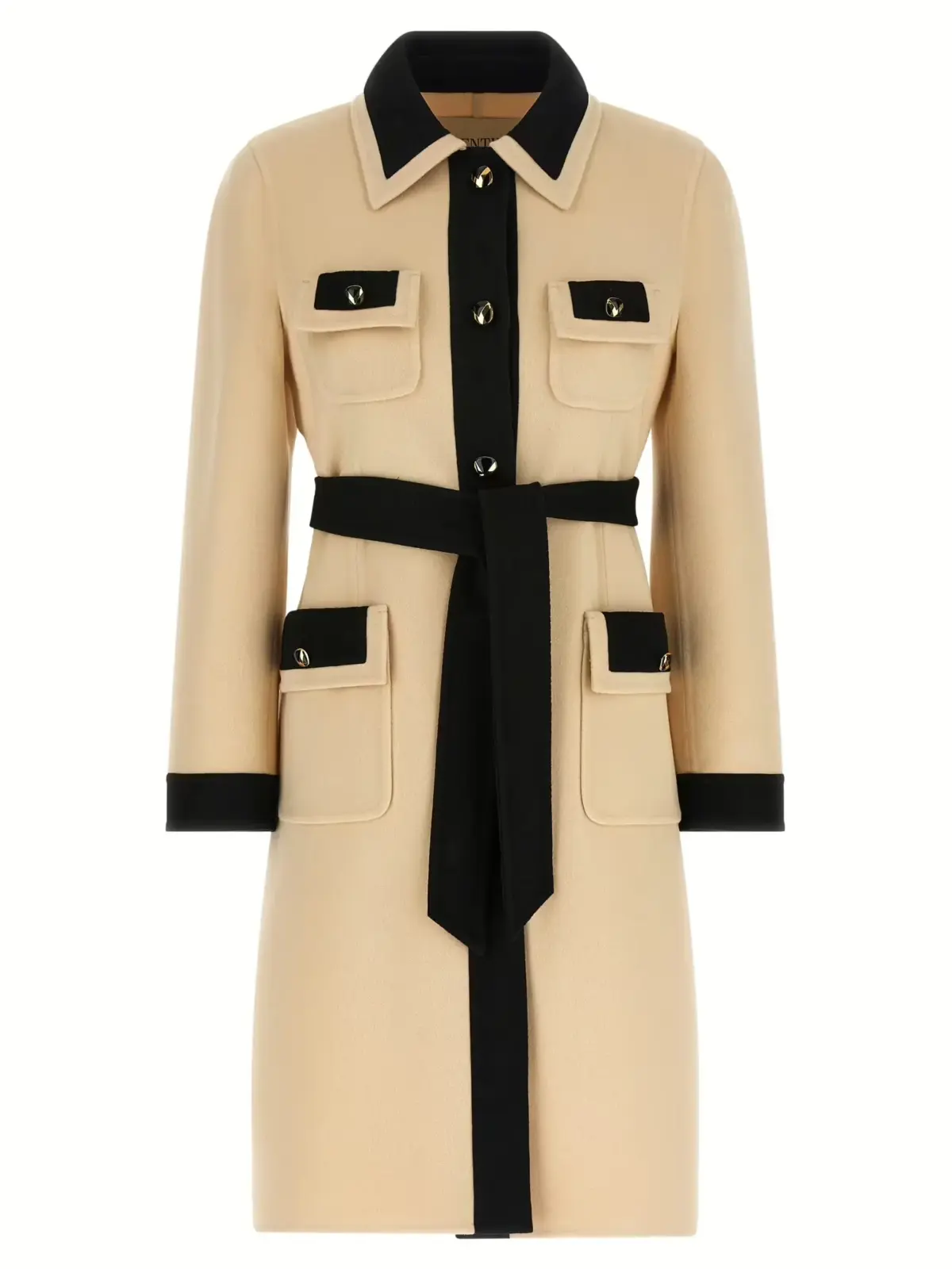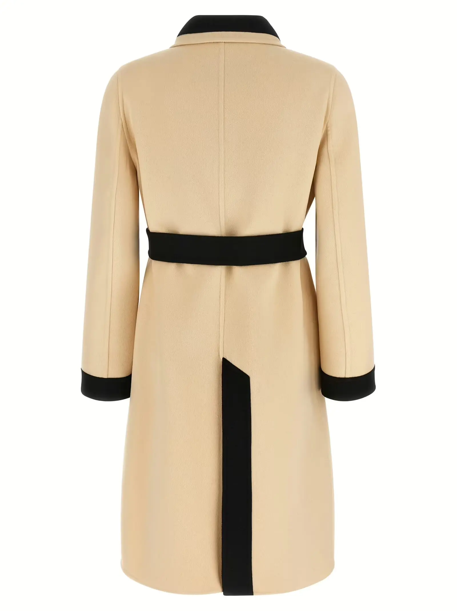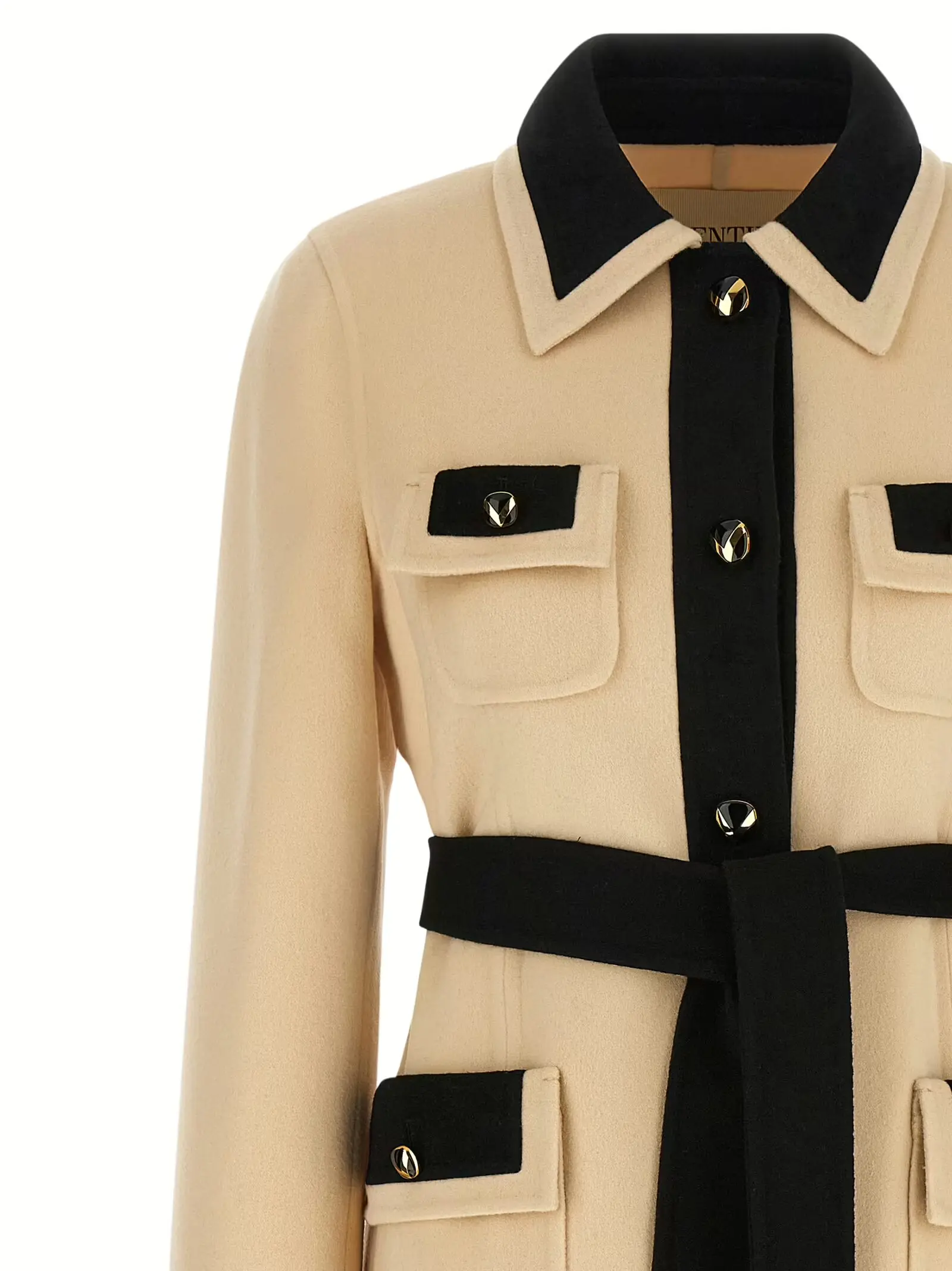 Чорно-біле пальто з мілі довжиною виконане з вишуканої суміші 90% новозернової вовни та 10% кашеміру, поєднує в собі елегантний дизайн із коміром, контрастною обробкою, накладними кишенями та витонченим поясом, підкреслюючи статус і неповторний стиль сучасної жінки.