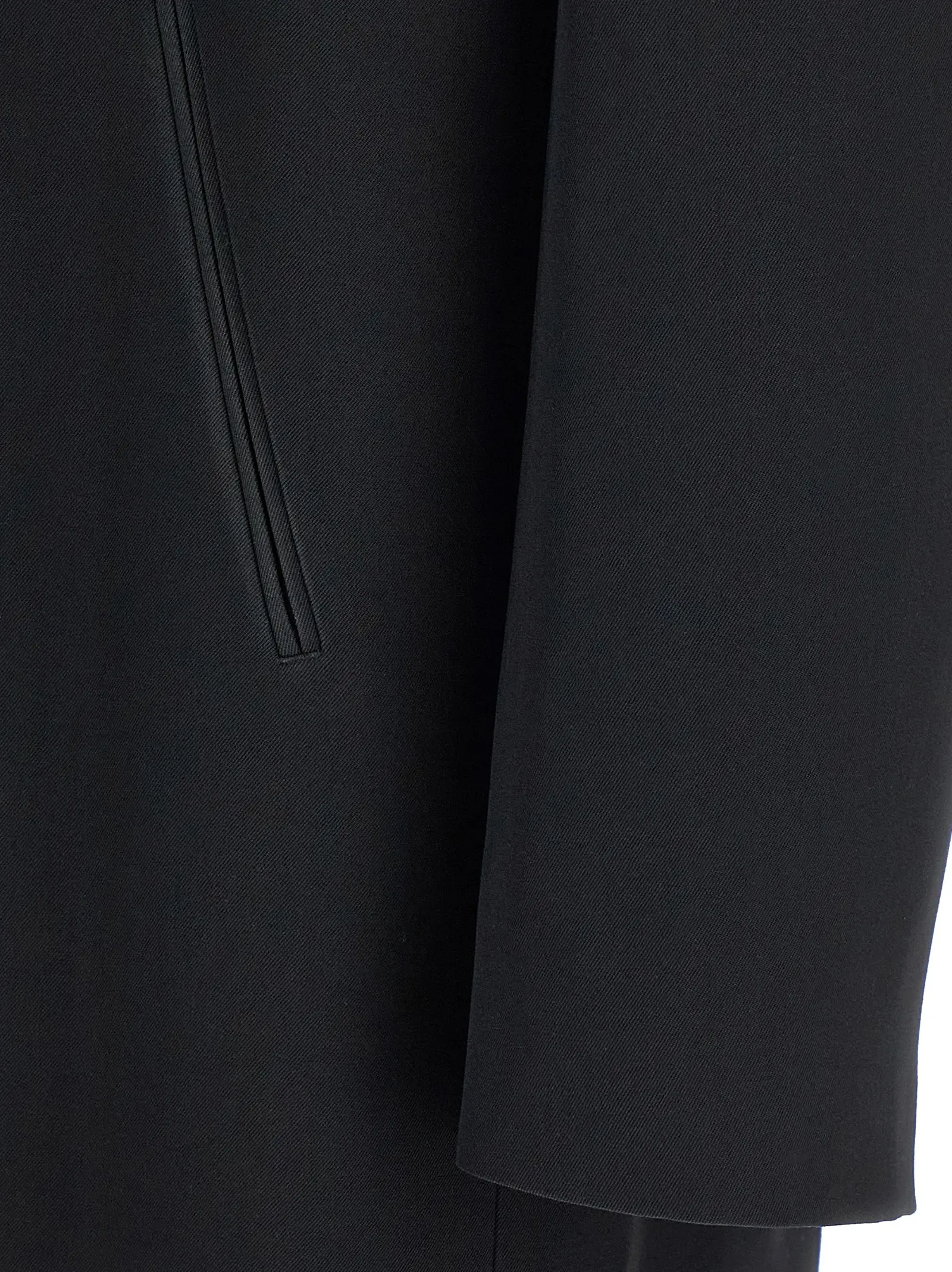 Пальто двобортне з вовни. Усередині легка стьобана підкладка з металевими гудзиками спереду. Лапелі з дзеркальним ефектом. Є кишені. Відворотні плечові стрічки з видимими стібками. Довгі рукави. Задня частина з декоративними швами у вигляді чотирьох стібків. Знімний внутрішній жилет з вовняної тканини в клітинку. Матеріал 100 відсотків вовна.