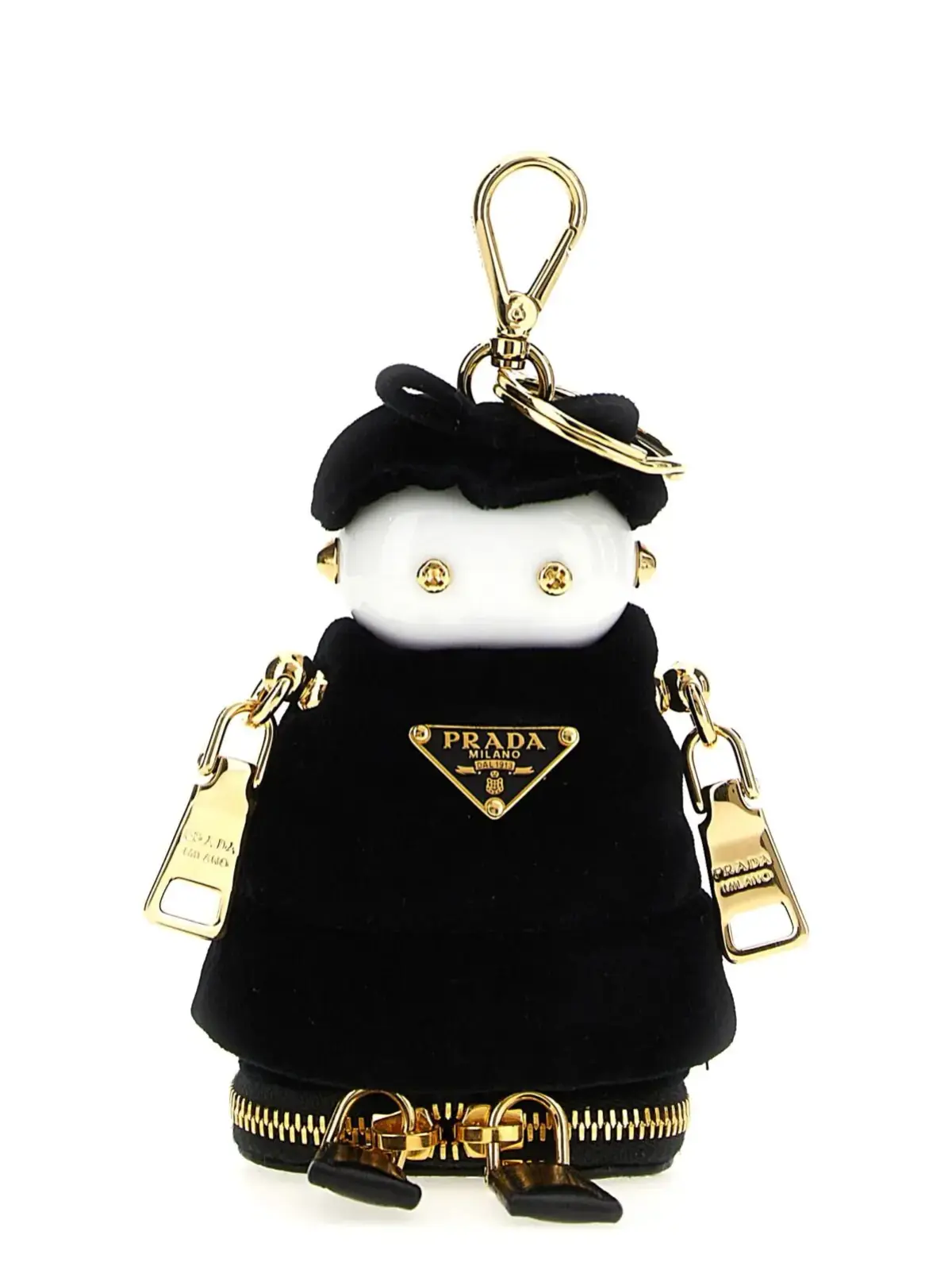 Підвіска для сумки Prada Soft Robot вишукано поєднує в собі розкішний оксамит чорного кольору та елегантні металеві деталі, створюючи враження статусності та стилю. Емальований логотип у формі трикутника додає сучасного акценту, а знімний та регульований плечовий ремінь з нейлону забезпечує універсальність у використанні. Виготовлена з 100% сталі, ця підвіска є не лише естетично привабливою, але й екологічно свідомою, підкреслюючи інноваційний підхід бренду до моди.