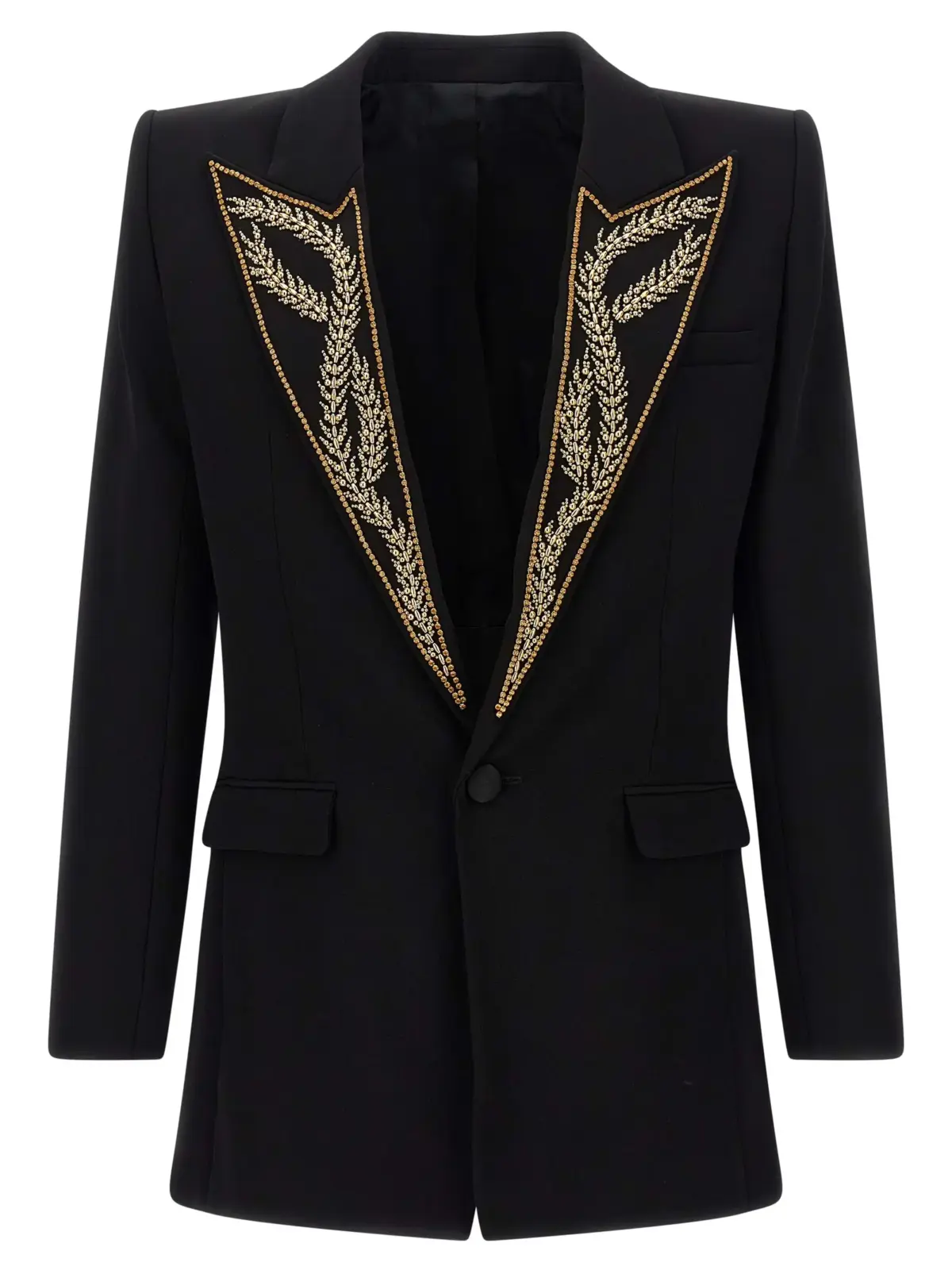 Чорний чоловічий піджак із візкозного крепу з однобортною застібкою, витонченим силуетом пісочного годинника та вишуканою вишивкою листя на лацканах, прикрашених металевими перлинами й кристалами. Максимально підплечені плечі, довгі рукави, нагрудна та клапанні кишені, розріз ззаду і розкішна атласна підкладка підкреслюють бездоганну якість, інноваційний дизайн і стиль високого статусу, що робить цей піджак універсальним вибором для сучасного джентльмена.