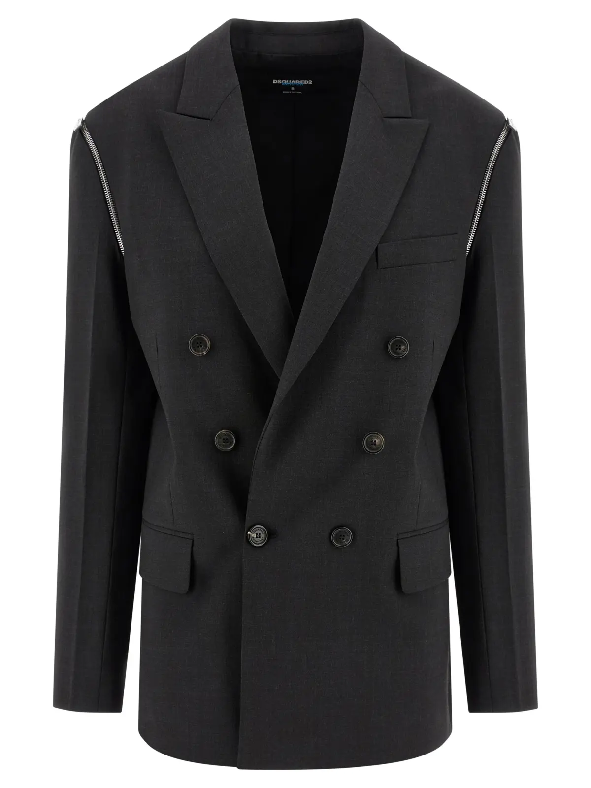 Двобортний піджак з вовни. Передня застібка на ґудзики. Лацкани з гострими кутами. Нагрудна кишеня. Кишені з клапанами. Структуровані плечові паски. Знімні довгі рукави на блискавці. Вентиляційні розрізи ззаду. Підкладка з монограмного полотна. Склад 95 відсотків вовни, 5 відсотків еластану.