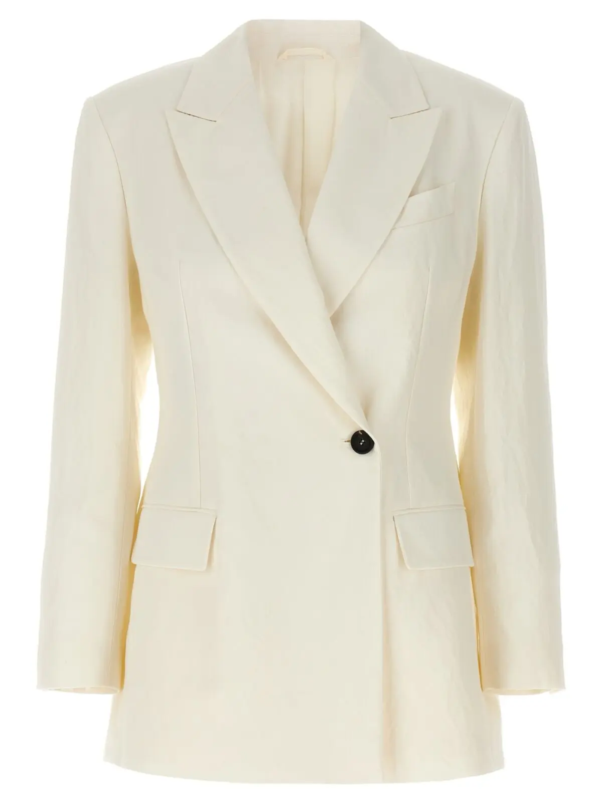 Цей двобортний піджак Brunello Cucinelli в білому кольорі вражає своєю елегантністю та сучасним дизайном. Виготовлений зі змішаного матеріалу, що складається з 58% паперової пряжі та 42% віскози, він забезпечує комфорт і стиль у будь-якій ситуації. Пікові лацкани, контрастні ґудзики та функціональні кишені підкреслюють його вишуканість, а зручна підкладка і легкі плечи забезпечують ідеальну посадку. Цей піджак є не лише символом статусу, але й свідченням уваги до деталей та інноваційного підходу до моди, що робить його універсальним вибором для будь-якого гардеробу.