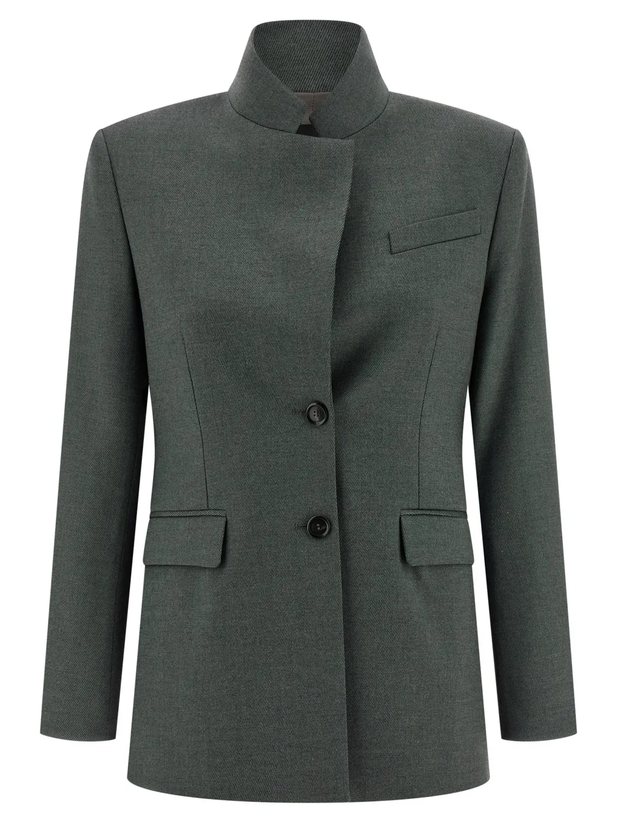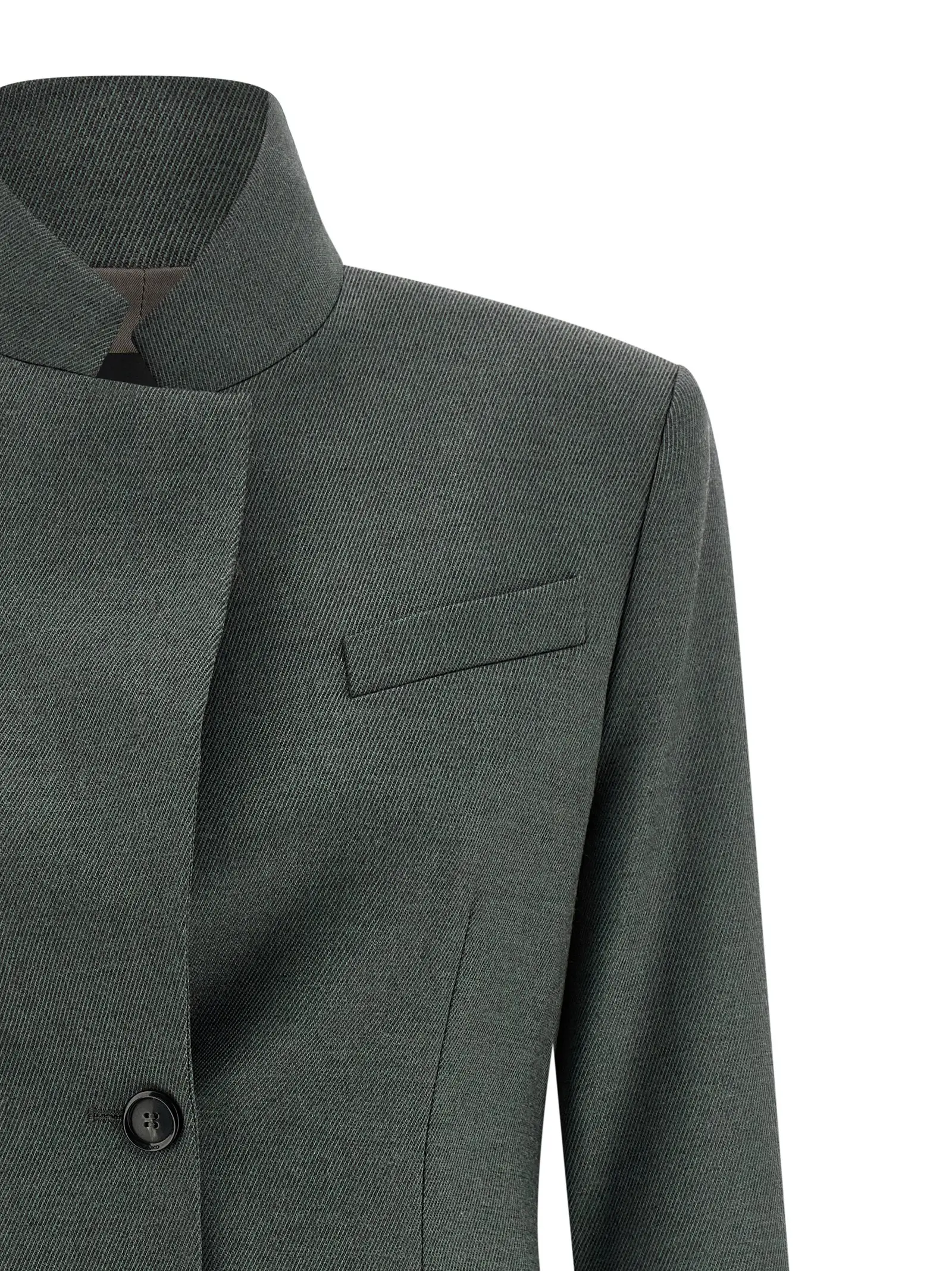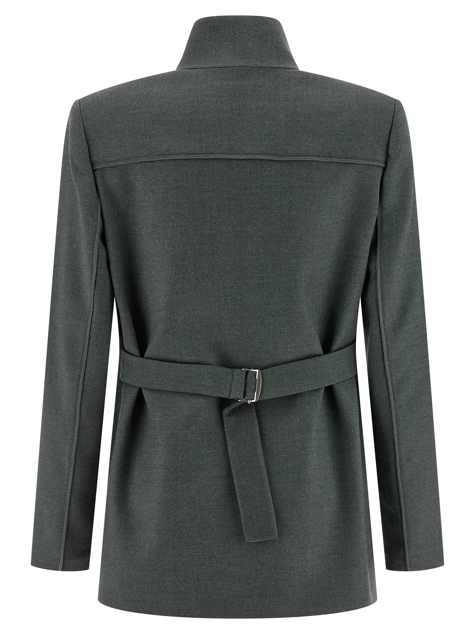 Піджак однобортний. Виконаний з вовняного фланелю та віскози. Має тоновані декоративні деталі. Застібається на ґудзики спереду. Володіє відкладним коміром. Є нагрудна кишеня та кишені з клапанами. Присутні плечові підплічники. Рукави довгі. На спині є регульований пояс. Склад матеріалу включає поліестер, вовну, акрил та еластан.