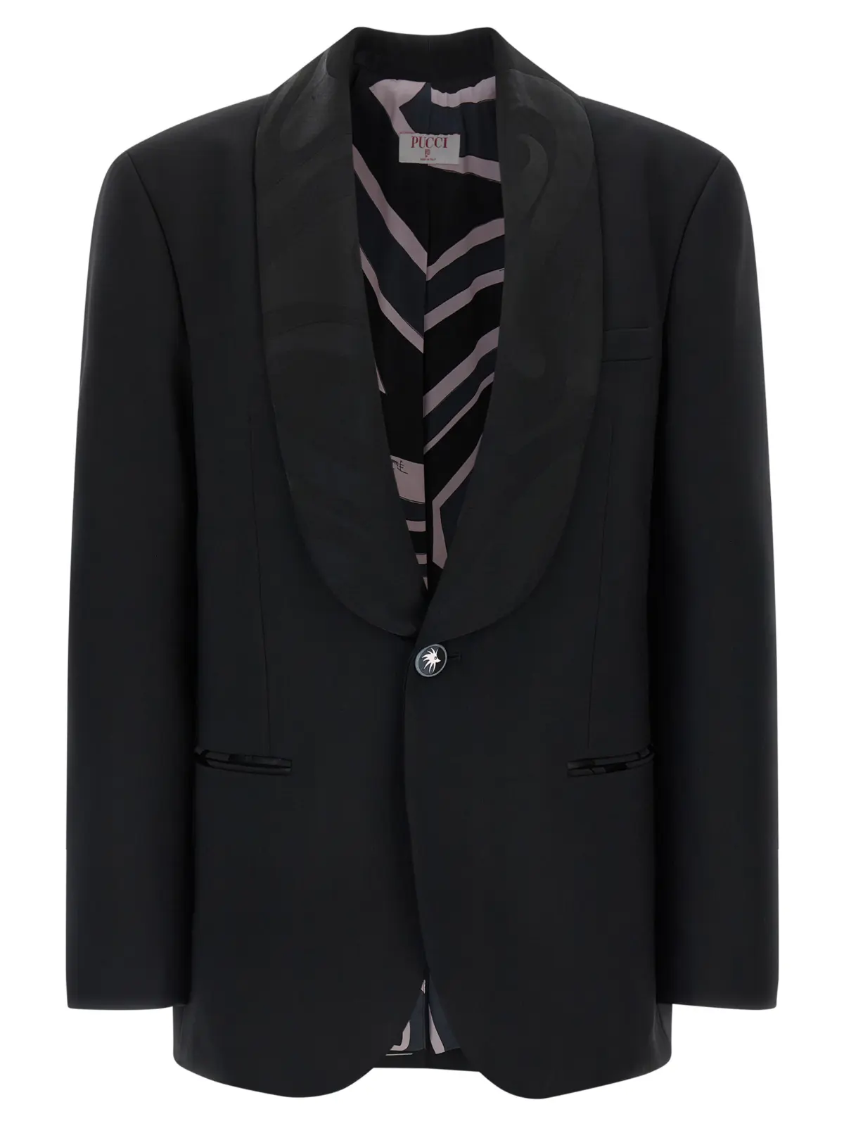 Однобортовий блейзер з застібкою на передні ґудзики. Комір-шаль з віскози, вовни та шовку. Наявність нагрудної кишені та накладних кишень. Плечі з наповнювачем. Довгі рукави. Розріз на спинці. Підкладка зі шовку з принтом. Склад матеріалу 95 відсотків вовни першого току та 5 відсотків еластану. Кожен виріб має індивідуальний розподіл принта.