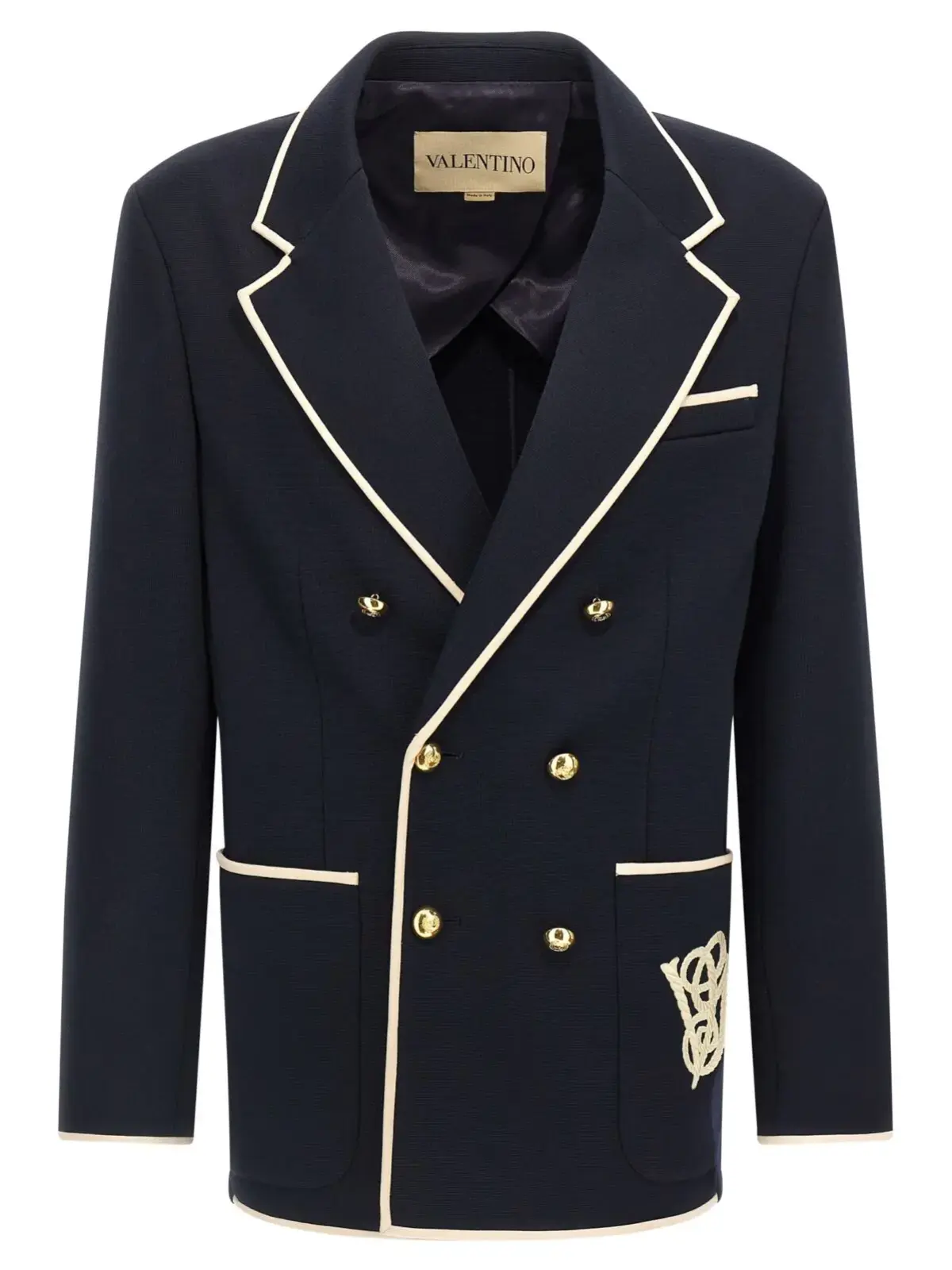 Цей двобортний чоловічий піджак з колекції Valentino Garavani виконаний з 100% високоякісної нової вовни, поєднуючи класичний силует із сучасними акцентами у вигляді контрастної обробки та емблемної вишивки. Елегантний дизайн із дзеркальними лацканами, структурованими плечима та деталями з металевими ґудзиками підкреслює статус і бездоганний стиль, забезпечуючи комфорт і універсальність для витонченого образу.