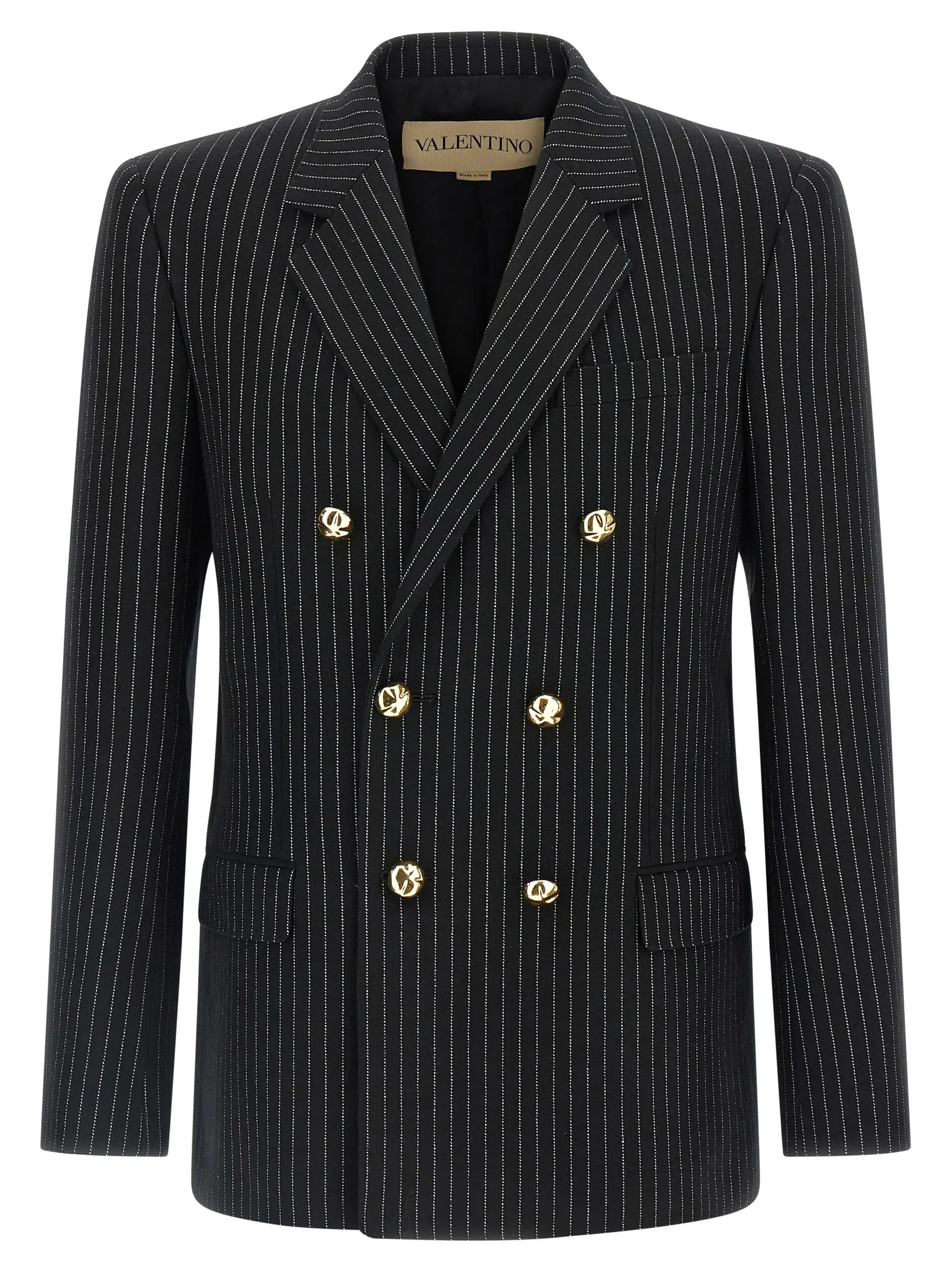 Чорно-білий двобортний чоловічий піджак, виготовлений із преміальної вовни з додаванням шовку та еластану, поєднує традиційну повноцінну конструкцію каркаса з інноваційними деталями, такими як дзеркальні лацкани та металеві ґудзики, підкреслюючи статус і бездоганний стиль, водночас забезпечуючи комфорт і універсальність завдяки монограмній підкладці з купро.