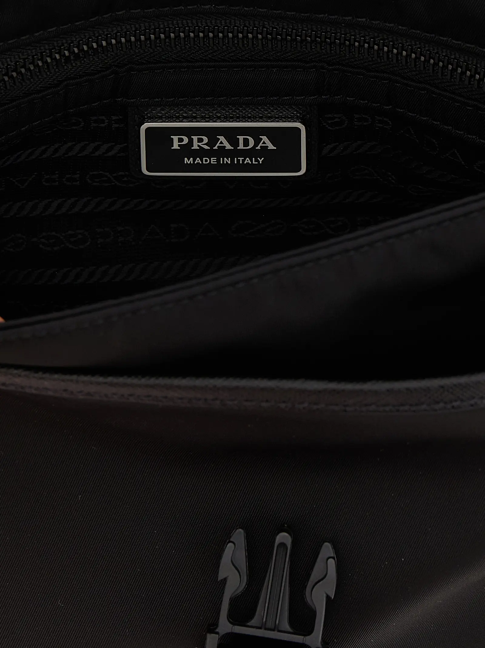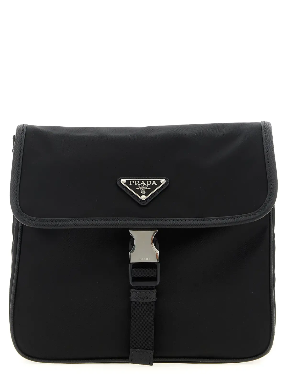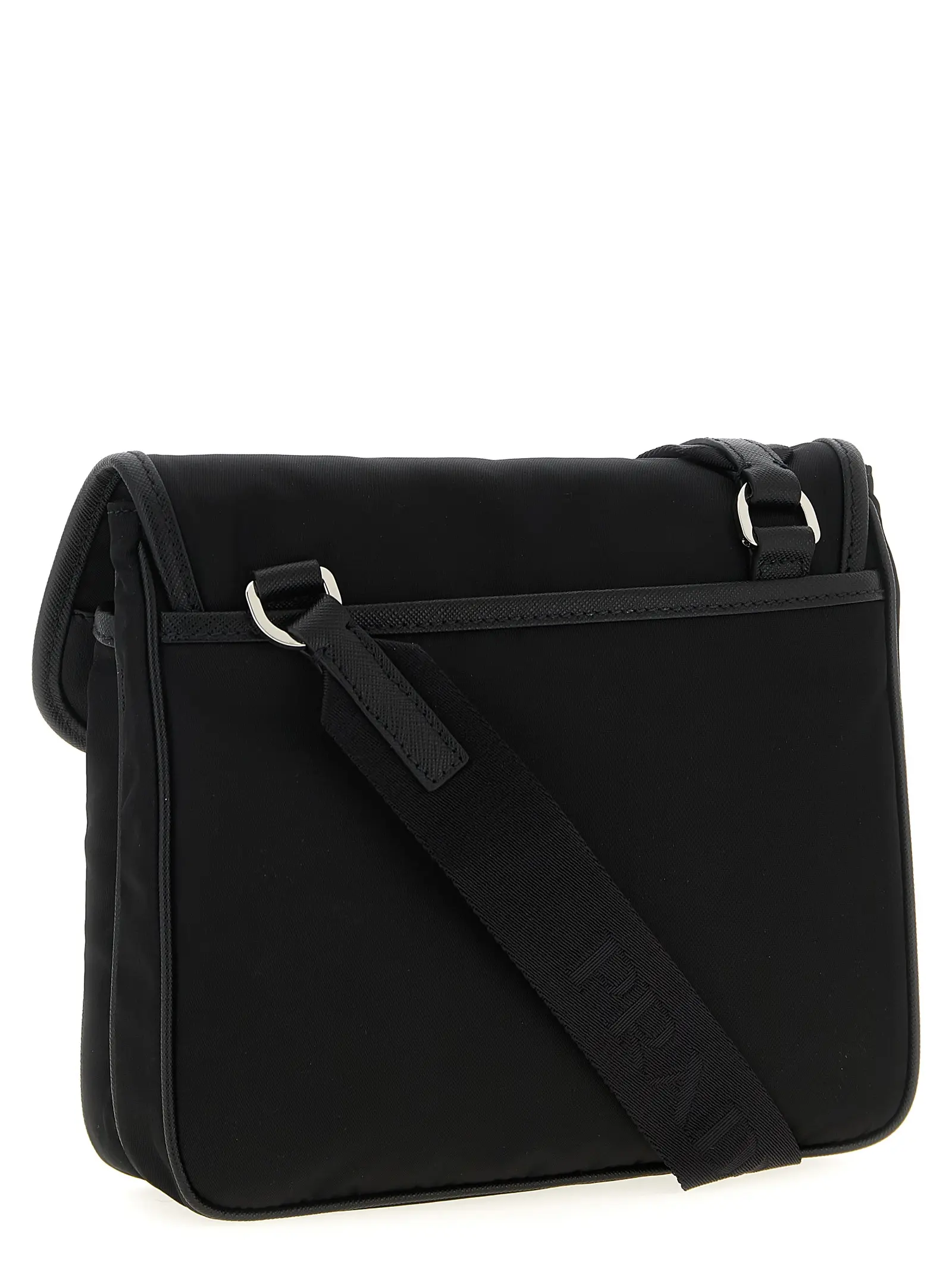 Плечовий ремінь чорного кольору з нейлону з деталями з саф’янової шкіри поєднує в собі інноваційні матеріали та бездоганну якість. Елегантний дизайн з металевим логотипом трикутної форми, зовнішніми кишенями на блискавці та регульованим ременем забезпечує універсальність і статусний вигляд у будь-якій ситуації.