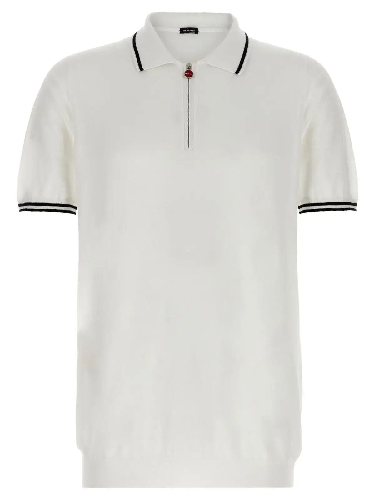 Поло Kiton Ciro білого кольору виготовлене з 100% високоякісної бавовни, поєднує в собі сучасний дизайн з контрастними деталями, напівблискавкою з логотипом та стильним коміром. Ця модель підкреслює статус і вишуканий стиль, забезпечуючи максимальний комфорт і універсальність у повсякденному гардеробі.