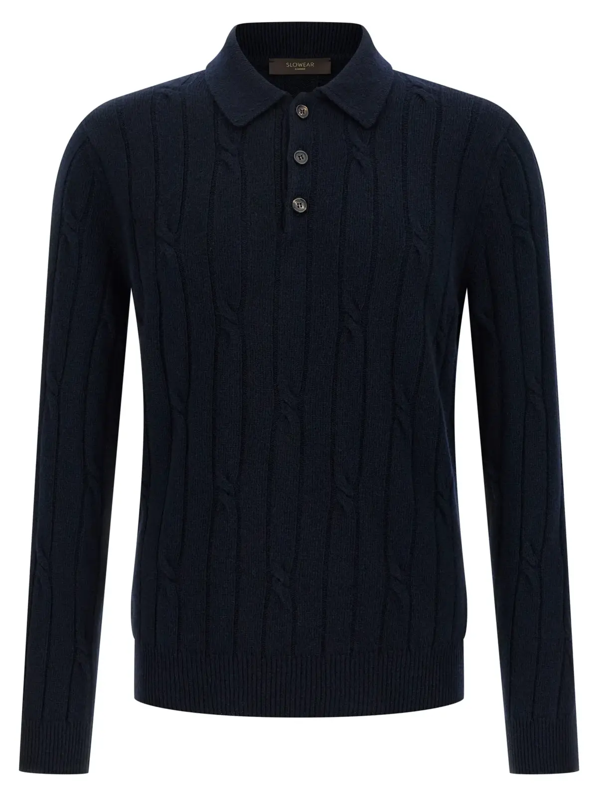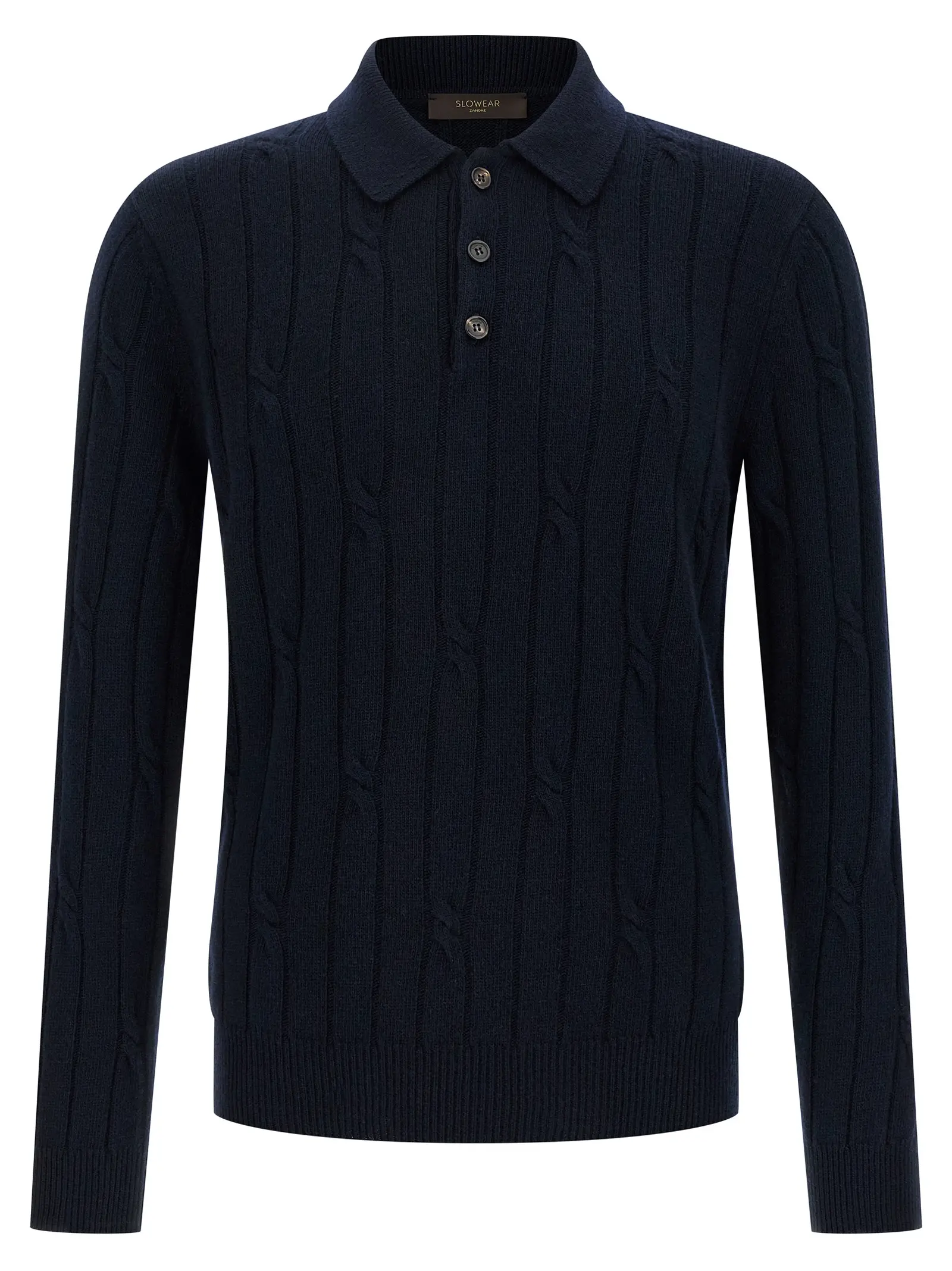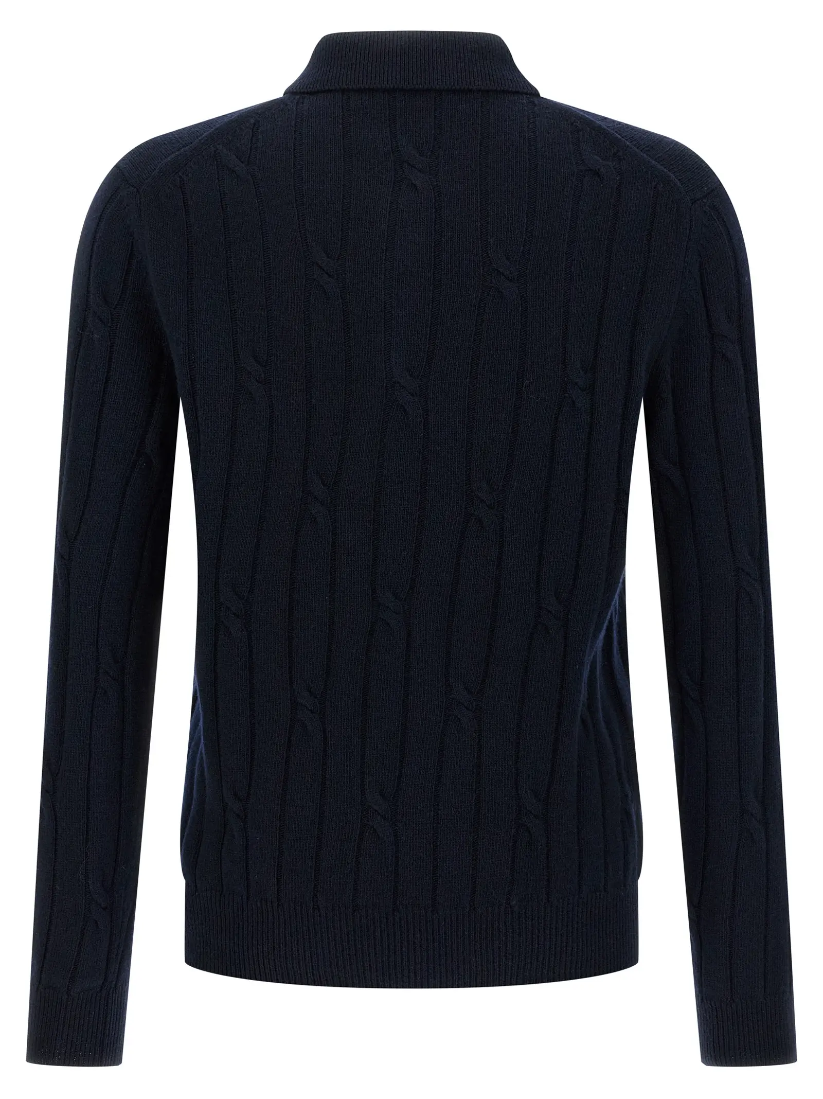 Чоловіча футболка-поло синього кольору з плетеним візерунком виконана з високоякісної суміші 70% новозеландської вовни та 30% кашеміру, що забезпечує неперевершену м’якість і тепло. Елегантний комірець, трьохкнопкове застібання та довгі манжети підкреслюють бездоганний стиль і універсальність, створюючи образ витонченості та статусу.